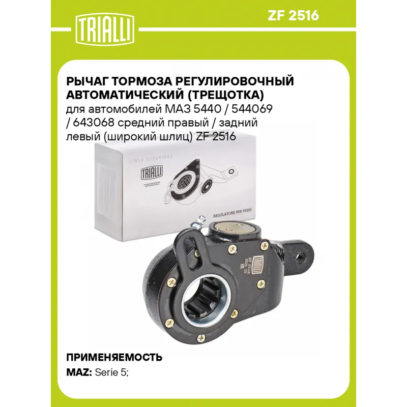 Рычаг тормоза регулировочный автоматический (трещотка) для автомобилей МАЗ 5440 / 544069 / 643068 средний правый / задний левый (широкий шлиц) Характеристики: Артикул: ZF 2516 OEM номера: 64226-3502136 Особенности конструкции:: Широкий шлиц Гарантийный срок: 2 года / 60 000 км Сторона установки: Средняя ось справа/задняя ось слева Параметры шлица: 10-40.3мм-32.5мм-5.3мм Товарная линейка: BLACK Длина плеча 1, мм: 150 Диаметр отверстия фланца 1, мм: 12 Количество на автомобиль: 2 Тип: Автоматический Комплектация: Рычаг тормоза регулировочный - 1 шт Гарантия: от 1 года.