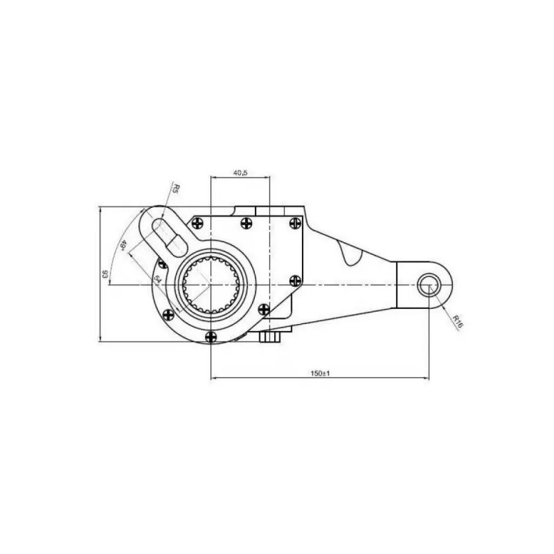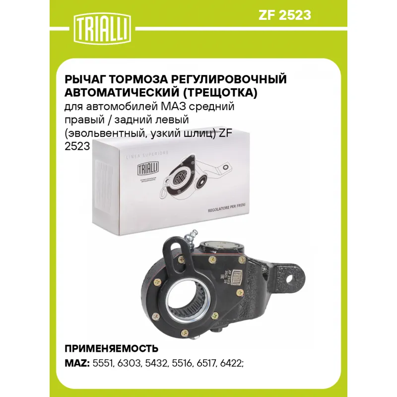 Рычаг тормоза регулировочный автоматический (трещотка) для автомобилей МАЗ средний правый / задний левый (эвольвентный, узкий шлиц) Характеристики: Артикул: ZF 2523 OEM номера: 54321-3502136 Особенности конструкции:: Эвольвентный, узкий шлиц Гарантийный срок: 2 года / 60 000 км Сторона установки: Средняя ось справа/задняя ось слева Параметры шлица: 25-40мм-37мм Товарная линейка: BLACK Длина плеча 1, мм: 150 Диаметр отверстия фланца 1, мм: 12 Количество на автомобиль: 2 Тип: Автоматический Комплектация: Рычаг тормоза регулировочный - 1 шт Гарантия: от 1 года.
