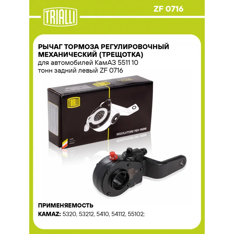 Рычаг тормоза регулировочный механический (трещотка) для автомобилей КамАЗ 5511 10 тонн задний левый Характеристики: Артикул: ZF 0716 OEM номера: 5511-3502237 Сторона установки: Задняя ось слева Товарная линейка: BLACK Длина плеча 1, мм: 150 Диаметр отверстия фланца 1, мм: 12.1 Парный товар: ZF 0715 Количество на автомобиль: 1 Тип: Механический Особенности конструкции:: 10 тонн Параметры шлица: 10-31.3мм-38.4мм-6мм Гарантийный срок: 2 года / 60 000 км Подходит для авто: КамаАЗ 5320, 53212, 5410, 54112, 55102, 5511, 55111 Для проверки применяемости отправьте VIN автомобиля через вкладку "Есть вопросы о товаре?" Комплектация: Рычаг тормоза регулировочный - 1 шт Гарантия: от 1 года.