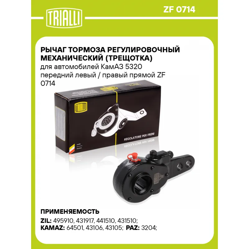 Рычаг тормоза регулировочный механический (трещотка) для автомобилей КамАЗ 5320 передний левый / правый прямой Характеристики: Артикул: ZF 0714 OEM номера: 5320-3501136, 120-3502136 Сторона установки: Передняя ось слева/справа Товарная линейка: BLACK Длина плеча 1, мм: 102 Длина плеча 2, мм: 125 Диаметр отверстия фланца 1, мм: 12.1 Диаметр отверстия фланца 2, мм: 12.1 Количество на автомобиль: 2 Тип: Механический Особенности конструкции:: Прямой Параметры шлица: 10-31.3мм-38.4мм-6мм Гарантийный срок: 2 года / 60 000 км Подходит для авто: ZIL 495910, 431917, 441510, 431510, 494560, 433110, 442160, 433360, 433100, 130, 431410, 133, 133 КамаАЗ 64501, 43106, 43105 ПАЗ 3204 Для проверки применяемости отправьте VIN автомобиля через вкладку "Есть вопросы о товаре?" Комплектация: Рычаг тормоза регулировочный - 1 шт Гарантия: от 1 года.