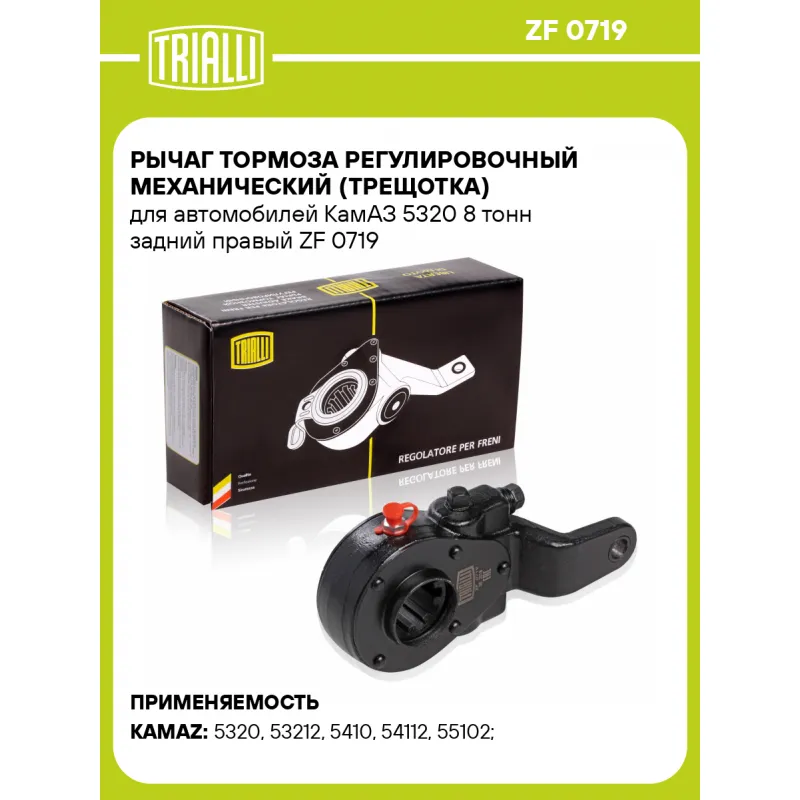 Рычаг тормоза регулировочный механический (трещотка) для автомобилей КамАЗ 5320 8 тонн задний правый Характеристики: Артикул: ZF 0719 OEM номера: 5320-3502136 Сторона установки: Задняя ось справа Товарная линейка: BLACK Длина плеча 1, мм: 125 Диаметр отверстия фланца 1, мм: 12.1 Парный товар: ZF 0720 Количество на автомобиль: 1 Тип: Механический Особенности конструкции:: 8 тонн Параметры шлица: 10-31.3мм-38.4мм-6мм Гарантийный срок: 2 года / 60 000 км Отверстия фланца, мм: 12 Подходит для авто: КамаАЗ 5320, 53212, 5410, 54112, 55102, 5511, 55111 Для проверки применяемости отправьте VIN автомобиля через вкладку "Есть вопросы о товаре?" Комплектация: Рычаг тормоза регулировочный - 1 шт Гарантия: от 1 года.