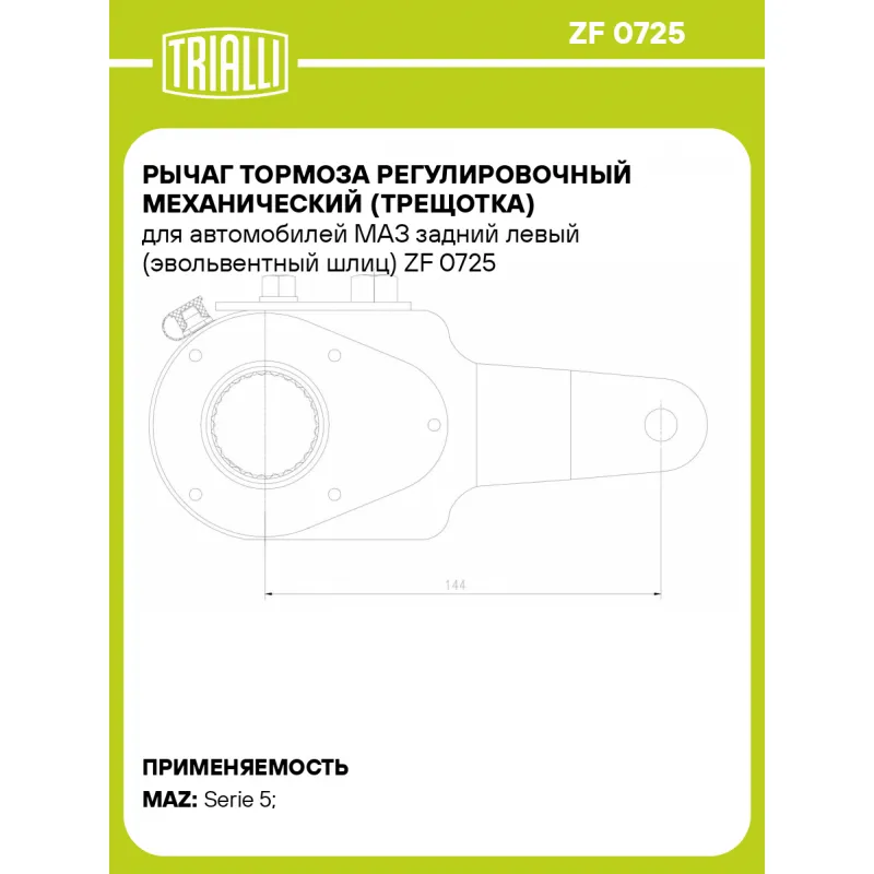 Рычаг тормоза регулировочный механический (трещотка) для автомобилей МАЗ задний левый (эвольвентный шлиц) Характеристики: Артикул: ZF 0725 OEM номера: 64221-3501135-010, 64221-3501135-10 Особенности конструкции:: Эвольвентный шлиц Гарантийный срок: 2 года / 60 000 км Сторона установки: Задняя ось слева Товарная линейка: BLACK Длина плеча 1, мм: 144 Диаметр отверстия фланца 1, мм: 12 Парный товар: ZF 0724 Количество на автомобиль: 1 Тип: Механический Параметры шлица: 25-36.6мм-39.5мм Отверстия фланца, мм: 12 Комплектация: Рычаг тормоза регулировочный - 1 шт Гарантия: от 1 года.