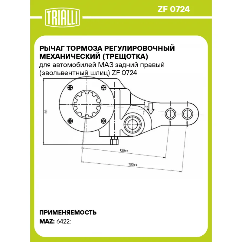 Рычаг тормоза регулировочный механический (трещотка) для автомобилей МАЗ задний правый (эвольвентный шлиц) Характеристики: Артикул: ZF 0724 OEM номера: 64221-3501136-010, 64221-3501136-10 Особенности конструкции:: Эвольвентный шлиц Гарантийный срок: 2 года / 60 000 км Сторона установки: Задняя ось справа Товарная линейка: BLACK Длина плеча 1, мм: 144 Диаметр отверстия фланца 1, мм: 12 Парный товар: ZF 0725 Количество на автомобиль: 1 Тип: Механический Параметры шлица: 25-36.6мм-39.5мм Отверстия фланца, мм: 12 Подходит для авто: МАЗ 6422, 6422 Для проверки применяемости отправьте VIN автомобиля через вкладку "Есть вопросы о товаре?" Комплектация: Рычаг тормоза регулировочный - 1 шт Гарантия: от 1 года.