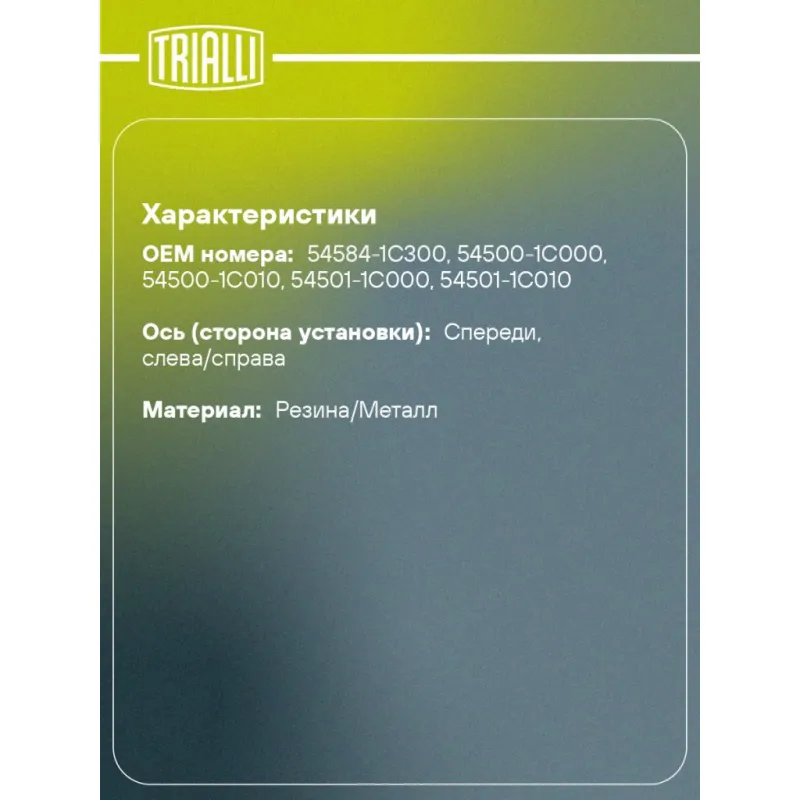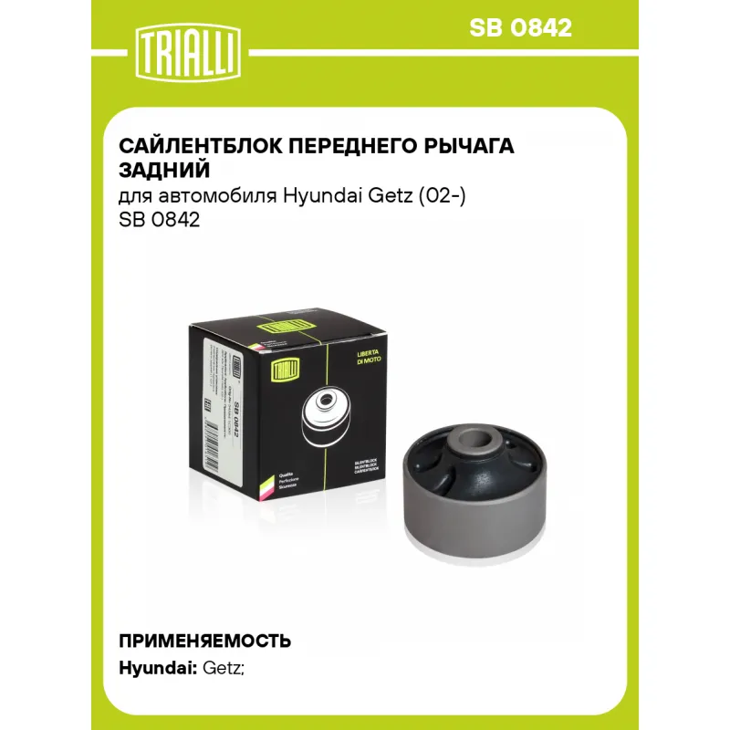 Сайлентблок переднего рычага задний для автомобиля Hyundai Getz (02-) Характеристики: Артикул: SB 0842 OEM номера: 54584-1C300, 54500-1C000, 54500-1C010, 54501-1C000, 54501-1C010 Гарантийный срок: 2 года/60 000 км Товарная линейка: BLACK Количество на автомобиль: 2 Ось (сторона установки): Спереди, слева/справа Материал: Резина/Металл Длина, мм: 55 Внешний диаметр, мм: 63 Внутренний диаметр, мм: 14 Количество деталей в артикуле, шт.: 1 Подходит для авто: Hyundai Getz (02-) Для проверки применяемости отправьте VIN автомобиля через вкладку "Есть вопросы о товаре?" Комплектация: Сайлентблок - 1 шт Гарантия: от 1 года.