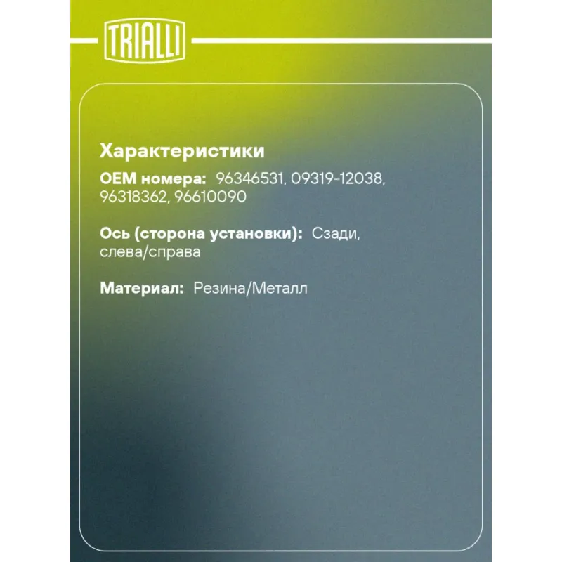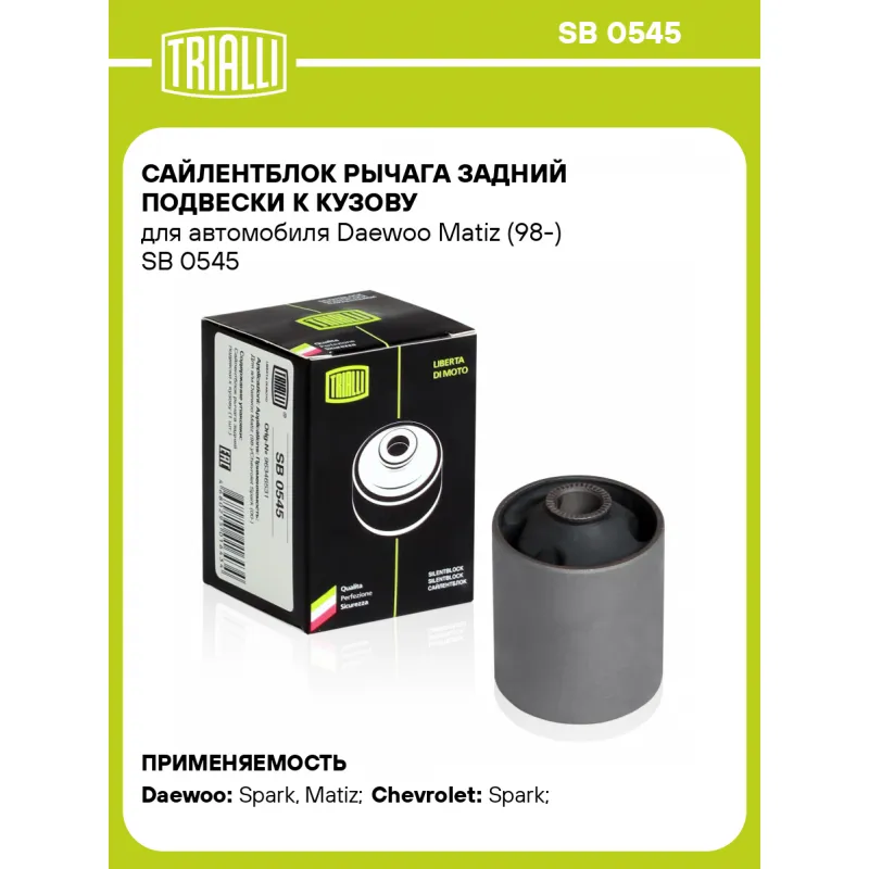 Сайлентблок рычага задний подвески к кузову для автомобиля Daewoo Matiz (98-) Характеристики: Артикул: SB 0545 OEM номера: 96346531, 09319-12038, 96318362, 96610090 Гарантийный срок: 2 года/60 000 км Товарная линейка: BLACK Количество на автомобиль: 2 Ось (сторона установки): Сзади, слева/справа Материал: Резина/Металл Длина, мм: 63 Внешний диаметр, мм: 46 Внутренний диаметр, мм: 12 Количество деталей в артикуле, шт.: 1 Подходит для авто: Daewoo Spark (98-), Matiz (98-), Matiz (01-) Chevrolet Spark (98-) Для проверки применяемости отправьте VIN автомобиля через вкладку "Есть вопросы о товаре?" Комплектация: Сайлентблок - 1 шт Гарантия: от 1 года.
