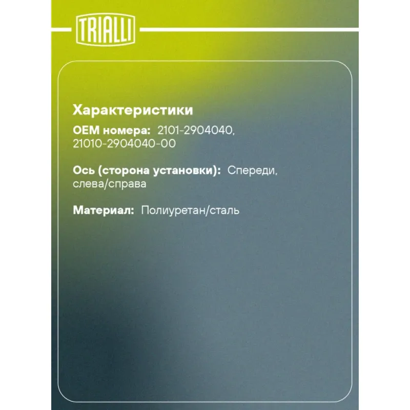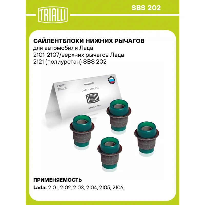 Сайлентблоки нижних рычагов для автомобиля Лада 2101-2107/верхних рычагов Лада 2121 (полиуретан) Характеристики: Артикул: SBS 202 OEM номера: 2101-2904040, 21010-2904040-00 Гарантийный срок: 2 года/60 000 км Товарная линейка: PRO Количество на автомобиль: 1 Ось (сторона установки): Спереди, слева/справа Материал: Полиуретан/сталь Дополнительная информация: Цвет изделия, может отличаться от представленного на фото Количество деталей в артикуле, шт.: 4 Подходит для авто: ВАЗ 2101, 2101, 2102, 2102, 2103, 2103, 2104, 2105, 2105, 2106, 2106, 2107, 2121, 21213, 2131, 2104, 2105, 2107, 21213, 2131, 2120 Для проверки применяемости отправьте VIN автомобиля через вкладку "Есть вопросы о товаре?" Комплектация: Сайлентблок - 4 шт Гарантия: от 1 года.