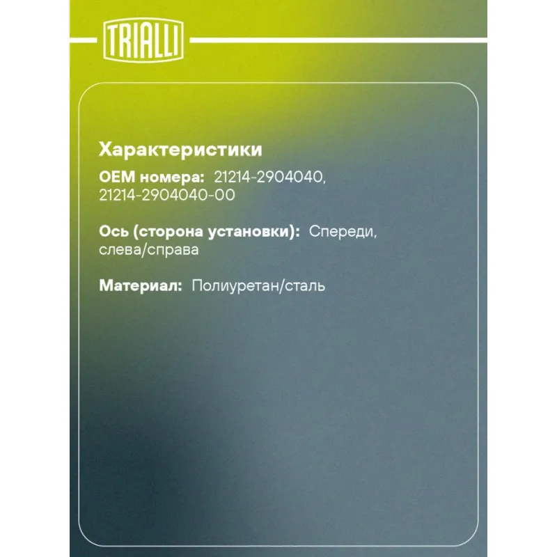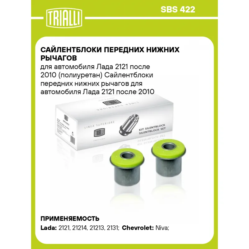 Сайлентблоки передних нижних рычагов для автомобиля Лада 2121 после 2010 (полиуретан) Характеристики: Артикул: SBS 422 OEM номера: 21214-2904040, 21214-2904040-00 Товарная линейка: PRO Ось (сторона установки): Спереди, слева/справа Материал: Полиуретан/сталь Гарантийный срок: 2 года/60 000 км Количество деталей в артикуле, шт.: 2 Подходит для авто: ВАЗ 2121, 21213, 2131, 2121, 21214, 21213, 2131, 2131 Chevrolet Niva (02-) Для проверки применяемости отправьте VIN автомобиля через вкладку "Есть вопросы о товаре?" Комплектация: Сайлентблок - 2 шт Гарантия: от 1 года.
