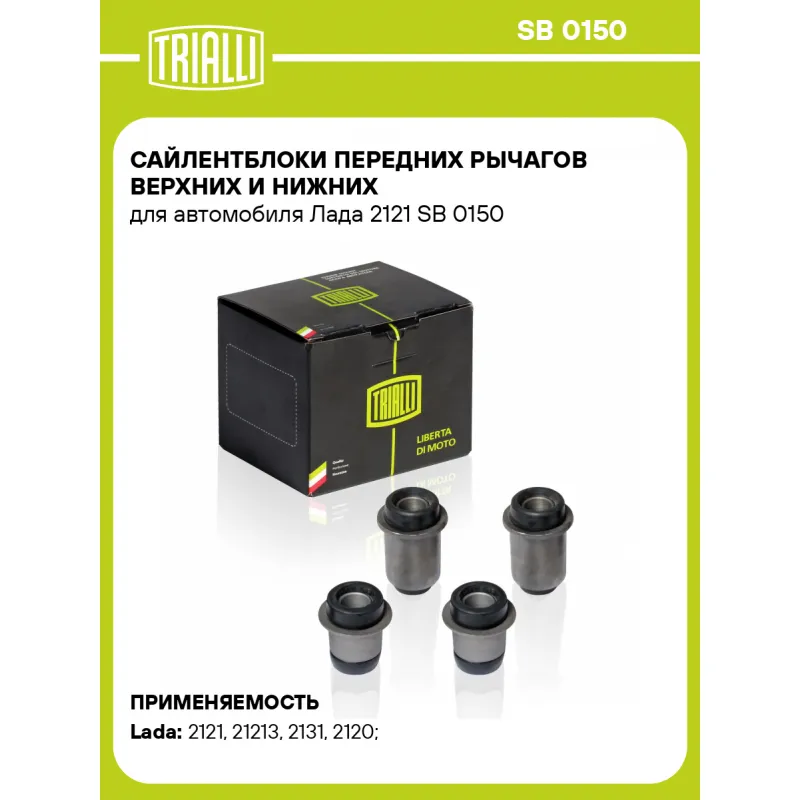 Сайлентблоки передних рычагов верхних и нижних для автомобиля Лада 2121 Характеристики: Артикул: SB 0150 OEM номера: 2101-2904040, 2121-2904040, 21010-2904040-00, 21210-2904040-00 Гарантийный срок: 2 года/60 000 км Товарная линейка: BLACK Количество на автомобиль: 1 Ось (сторона установки): Спереди, слева/справа Материал: Резина/Металл Количество деталей в артикуле, шт.: 4 Подходит для авто: ВАЗ 2121, 21213, 2131, 21213, 2131, 2120 Для проверки применяемости отправьте VIN автомобиля через вкладку "Есть вопросы о товаре?" Комплектация: Сайлентблок - 4 шт Гарантия: от 1 года.