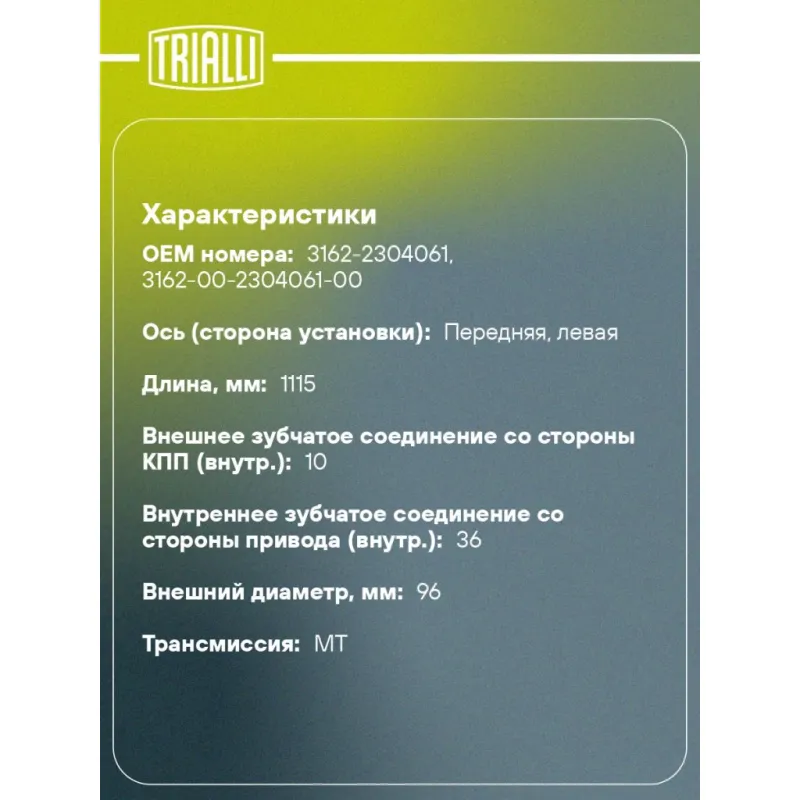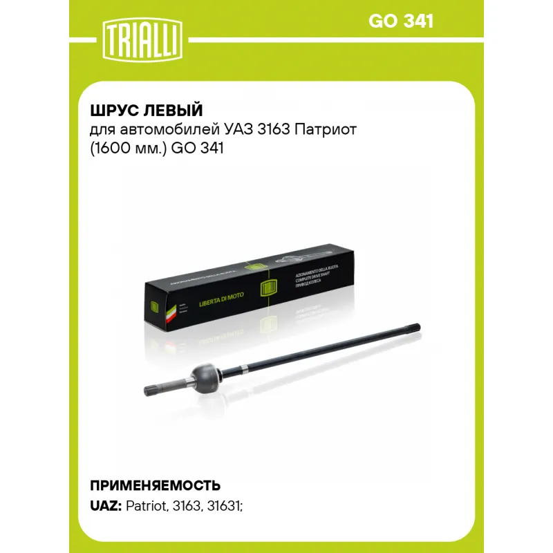 ШРУС левый для автомобилей УАЗ 3163 Патриот (1600 мм.) Характеристики: Артикул: GO 341 OEM номера: 3162-2304061, 3162-00-2304061-00 Тип КПП: MT Гарантийный срок: 2 года/60 000 км Материал пыльника: CR Парный товар: GO 340 Количество на автомобиль: 1 Сопутствующие товары:: GO 320,GO 331,GO 340 Ось (сторона установки): передняя, левая Длина, мм: 1115 Внешнее зубчатое соединение со стороны КПП (внутр.): 10 Внутреннее зубчатое соединение со стороны привода (внутр.): 36 Внешнее зубчатое соединение со стороны колеса (внеш.): 10 Внешний диаметр, мм: 96 Размер резьбы: М12-6H Особенности конструкции:: (мост Спайсер 1600 мм) Сопутствующий товар: ШРУСы: GO 310; GO 311; GO 340 Товарная линейка: BLACK Трансмиссия: MT ABS: + Подходит для авто: УАЗ Patriot (97-), Patriot (08-), Patriot (97-), Patriot (97-), 3163 (Patriot) (05-), 31631, Patriot (08-) Для проверки применяемости отправьте VIN автомобиля через вкладку "Есть вопросы о товаре?" Комплектация: Шрус левый - 1 шт Гарантийный талон - 1 шт Гарантия: от 1 года.