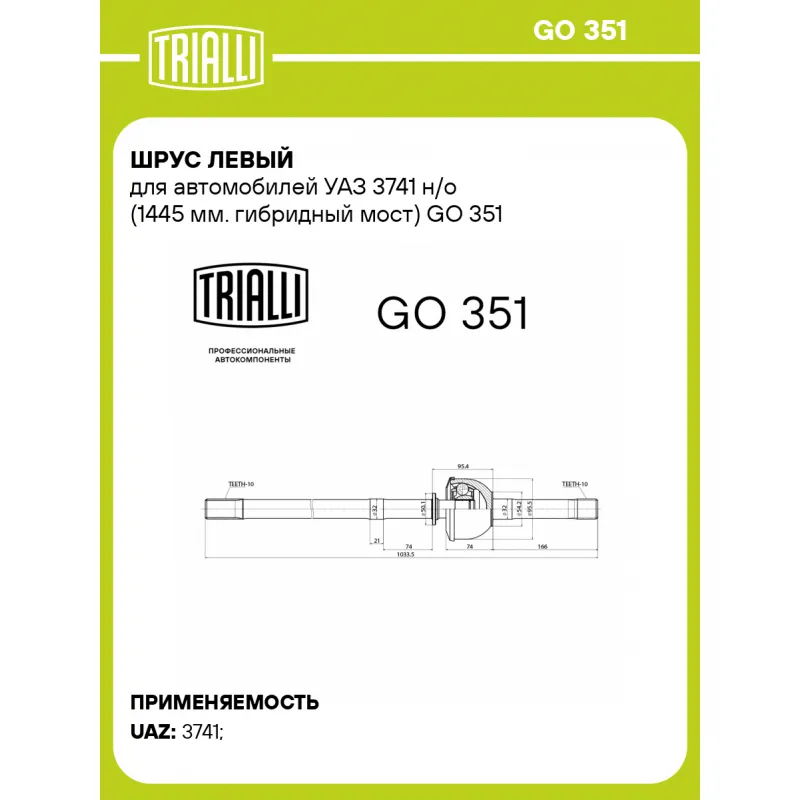 ШРУС левый для автомобилей УАЗ 3741 н/о (1445 мм. гибридный мост) Характеристики: Артикул: GO 351 OEM номера: 3741-2304061-01 Тип КПП: MT Гарантийный срок: 2 года/60 000 км Материал пыльника: CR Парный товар: GO 350 Количество на автомобиль: 1 Ось (сторона установки): Передняя, левая Длина, мм: 1033,5 Внешнее зубчатое соединение со стороны колеса (внеш.): 10 Внутреннее зубчатое соединение со стороны колеса (внеш.): 10 Внешний диаметр, мм: 95,5 Сопутствующий товар: ШРУСы: GO 310; GO 311; GO 320; GO 321; GO 330; GO 331; GO 350 Товарная линейка: BLACK Подходит для авто: УАЗ 3741, 3741, 3741 Для проверки применяемости отправьте VIN автомобиля через вкладку "Есть вопросы о товаре?" Комплектация: ШРУС - 1 шт Гарантийный талон - 1 шт Гарантия: от 1 года.