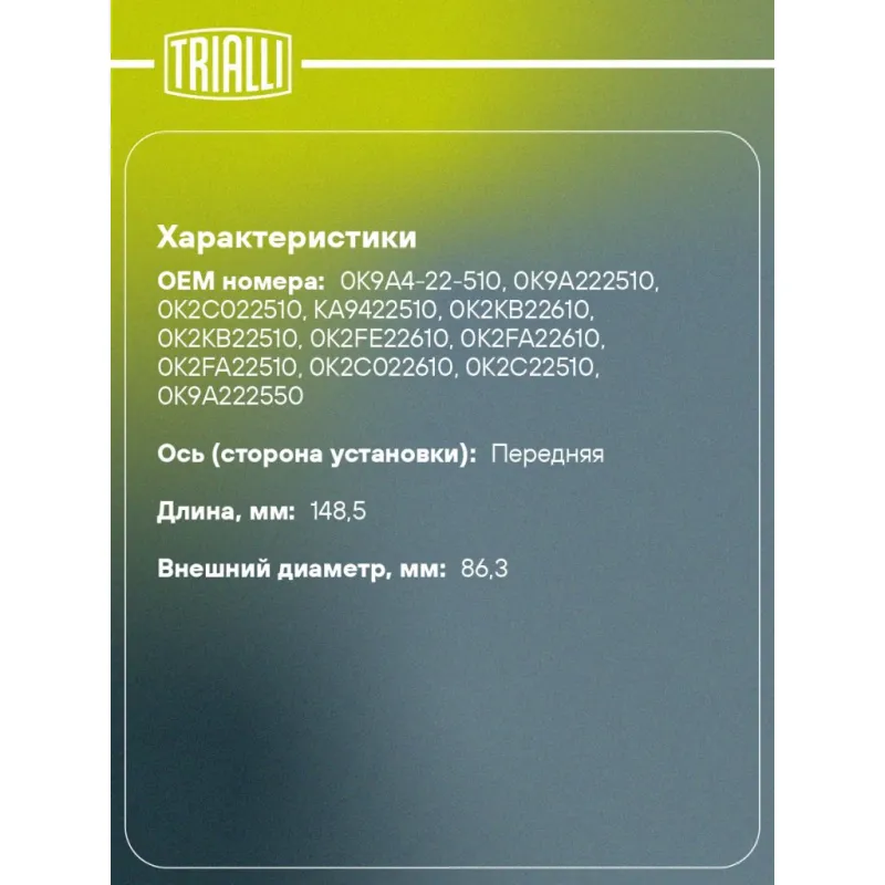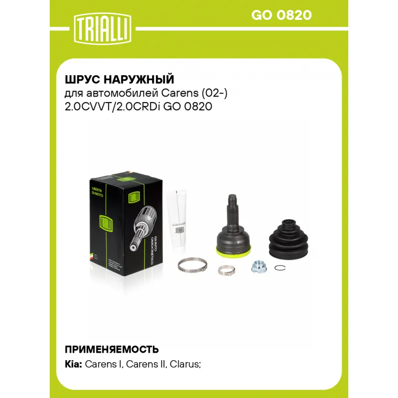 ШРУС наружный для автомобилей Carens (02-) 2.0CVVT/2.0CRDi Характеристики: Артикул: GO 0820 OEM номера: 0K9A4-22-510, 0K9A222510, 0K2C022510, KA9422510, 0K2KB22610, 0K2KB22510, 0K2FE22610, 0K2FA22610, 0K2FA22510, 0K2C022610, 0K2C22510, 0K9A222550, 0K2KB25400, 0K20022610, 0K2KB25600, 0K9A425500, K9A422510, 0K9B322610, 0K9B322510, 0K9A62550X, 0K9A425600, 0K2C122510 Тип КПП: MT/AT Материал пыльника: CR Количество на автомобиль: 2 Ось (сторона установки): передняя Длина, мм: 148,5 Гарантийный срок: 2 года/60 000 км Внешнее зубчатое соединение со стороны колеса (внеш.): 28 Внутреннее зубчатое соединение со стороны колеса (внеш.): 24 Внешний диаметр, мм: 86,3 Размер резьбы: М22х1,5 Сопутствующий товар: ШРУСы: GO 073141 Товарная линейка: BLACK Подходит для авто: Kia Carens I (99-), Carens II (06-), Carens II (06-), Clarus (96-) Для проверки применяемости отправьте VIN автомобиля через вкладку "Есть вопросы о товаре?" Комплектация: ШРУС - 1 шт Чехол ШРУСа - 1 шт Хомут - 2 шт Стопорное кольцо - 1 шт Гайка - 1 шт Смазка - 1 шт Гарантия: от 1 года.