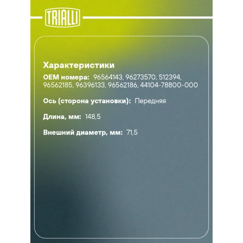 ШРУС наружный для автомобилей Daewoo Matiz (98-) ECO Характеристики: Артикул: GO 0541 OEM номера: 96564143, 96273570, 512394, 96562185, 96396133, 96562186, 44104-78800-000 Тип КПП: MT Материал пыльника: CR Товарная линейка: ECO Количество на автомобиль: 2 Ось (сторона установки): передняя Длина, мм: 148,5 Гарантийный срок: 2 года/60 000 км Внешнее зубчатое соединение со стороны колеса (внеш.): 23 Внутреннее зубчатое соединение со стороны колеса (внеш.): 19 Наличие/Отсутвие ABS: отсут. Внешний диаметр, мм: 71,5 Размер резьбы: М20х1.5 Сопутствующий товар: ШРУСы: GO 0542 Подходит для авто: Chevrolet Spark (98-) Daewoo Matiz (98-), Matiz (01-) Для проверки применяемости отправьте VIN автомобиля через вкладку "Есть вопросы о товаре?" Комплектация: ШРУС - 1 шт Пыльник - 1 шт Хомут - 2 шт Стопорное колько - 1 шт Гайка - 1 шт Тюбик со смазкой - 1 шт Гарантийный талон - 1 шт Гарантия: от 1 года.