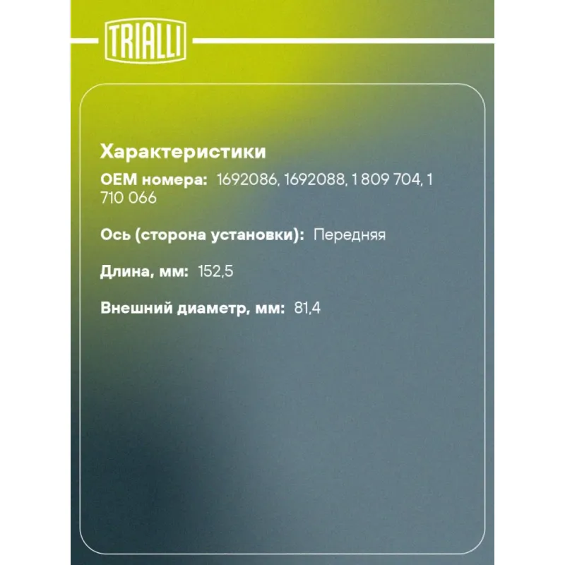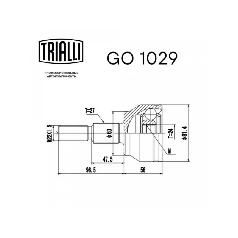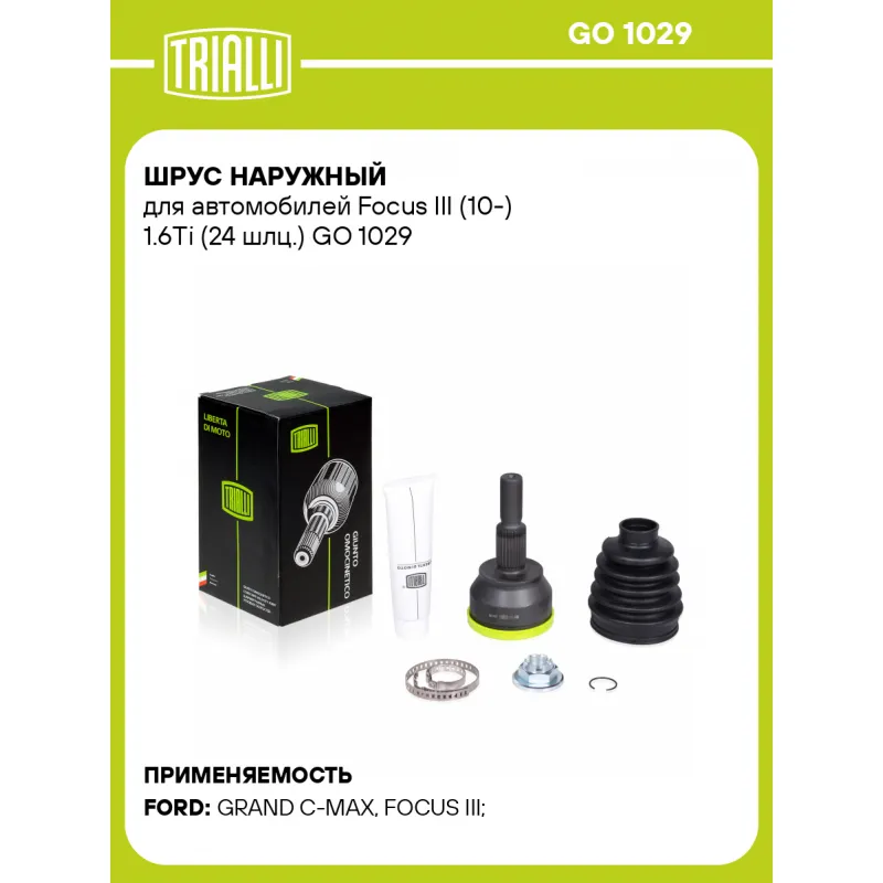 ШРУС наружный для автомобилей Focus III (10-) 1.6Ti (24 шлц.) Характеристики: Артикул: GO 1029 OEM номера: 1692086, 1692088, 1 809 704, 1 710 066 Тип КПП: MT Материал пыльника: CR Количество на автомобиль: 2 Ось (сторона установки): передняя Длина, мм: 152,5 Гарантийный срок: 2 года/60 000 км Внешнее зубчатое соединение со стороны колеса (внеш.): 27 Внутреннее зубчатое соединение со стороны колеса (внеш.): 24 Наличие/Отсутвие ABS: отсут Внешний диаметр, мм: 81,4 Размер резьбы: М22х1,5 Сопутствующий товар: Ремонтные комплекты ШРУСов: FG 1010 Сопутствующий товар: ШРУСы: GO 1003, GO 1026 Товарная линейка: BLACK Комплектация: ШРУС - 1 шт Чехол ШРУСа - 1 шт Хомут - 2 шт Стопорное кольцо - 1 шт Гайка - 1 шт Смазка - 1 шт Гарантия: от 1 года.