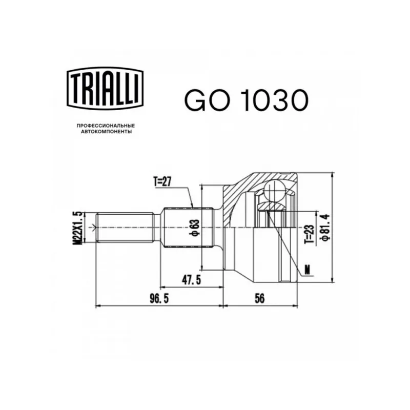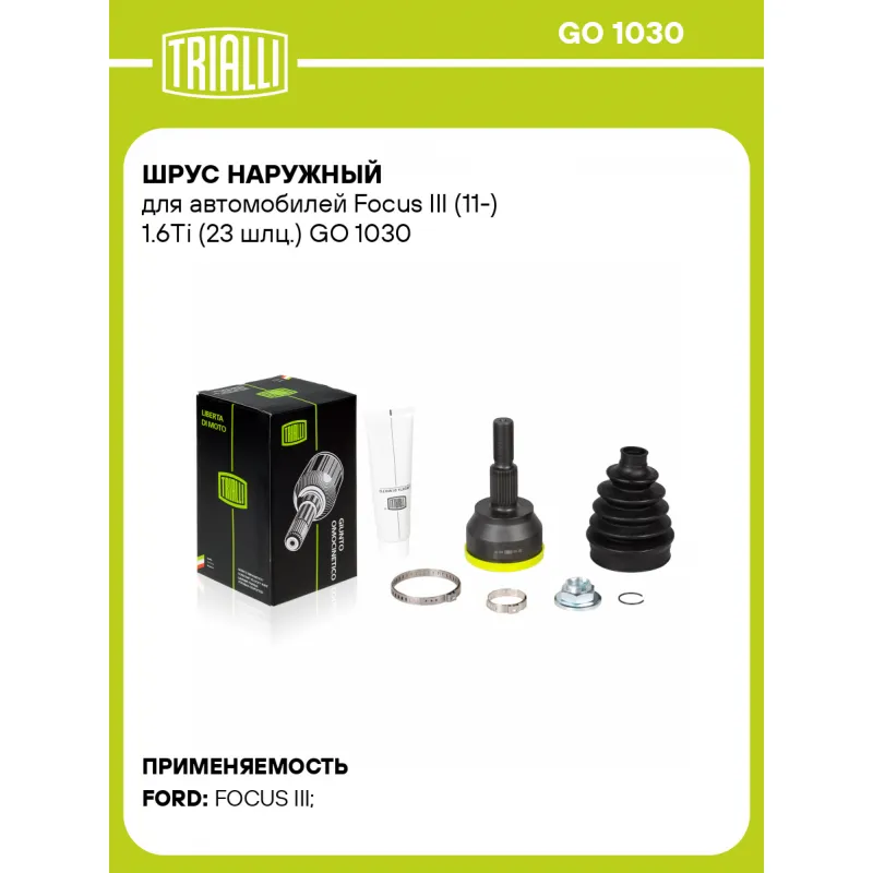 ШРУС наружный для автомобилей Focus III (11-) 1.6Ti (23 шлц.) Характеристики: Артикул: GO 1030 OEM номера: 1692463, BV6Z-3B436-B, 1708356, BV6Z-3B437-B, 1 809 706, 1 809 713 Тип КПП: AT Материал пыльника: CR Количество на автомобиль: 2 Ось (сторона установки): передняя Длина, мм: 152,5 Гарантийный срок: 2 года/60 000 км Внешнее зубчатое соединение со стороны колеса (внеш.): 27 Внутреннее зубчатое соединение со стороны колеса (внеш.): 23 Внешний диаметр, мм: 81,4 Размер резьбы: М22х1,5 Сопутствующий товар: Ремонтные комплекты ШРУСов: FG 1010 Сопутствующий товар: ШРУСы: GO 1003, GO 1026 Товарная линейка: BLACK Комплектация: ШРУС - 1 шт Чехол ШРУСа - 1 шт Хомут - 2 шт Стопорное кольцо - 1 шт Гайка - 1 шт Смазка - 1 шт Гарантия: от 1 года.