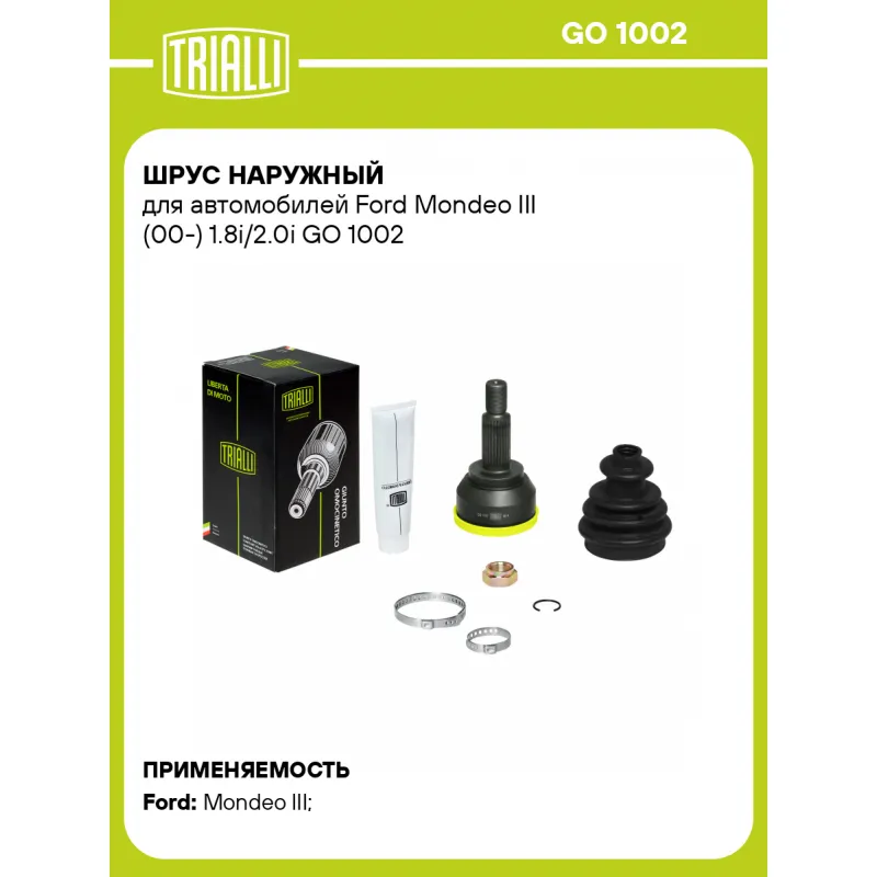 ШРУС наружный для автомобилей Ford Mondeo III (00-) 1.8i/2.0i Характеристики: Артикул: GO 1002 OEM номера: 1S7W 3B41 3AA, 2352 8020 1, 4 106 369, 1132506, 1600650, 1365235, 1314339, 1366430, 1326260, 1447471, 1329496, RM2S71-3A327-EB, 1600646, 1358229, 1214370, 1S71-3A327-AB, 1366169, 1320339, 2S71-3B437-CD, 1447467, 1329495, RM1S71-3A327-BB, 1447473, 1329501 Тип КПП: MT Гарантийный срок: 2 года/60 000 км Материал пыльника: CR Количество на автомобиль: 2 Ось (сторона установки): передняя Длина, мм: 148 Внешнее зубчатое соединение со стороны колеса (внеш.): 27 Внутреннее зубчатое соединение со стороны колеса (внеш.): 23 Наличие/Отсутвие ABS: отсут Внешний диаметр, мм: 81,4 Размер резьбы: М22*1,5 Сопутствующий товар: Ремонтные комплекты ШРУСов: FG 1013 Сопутствующий товар: ШРУСы: GO 1039, GO 1031 Товарная линейка: BLACK Трансмиссия: M/A Подходит для авто: Ford Mondeo III (00-) Для проверки применяемости отправьте VIN автомобиля через вкладку "Есть вопросы о товаре?" Комплектация: ШРУС - 1 шт Чехол ШРУСа - 1 шт Хомут - 2 шт Стопорное кольцо - 1 шт Гайка - 1 шт Смазка - 1 шт Гарантия: от 1 года.