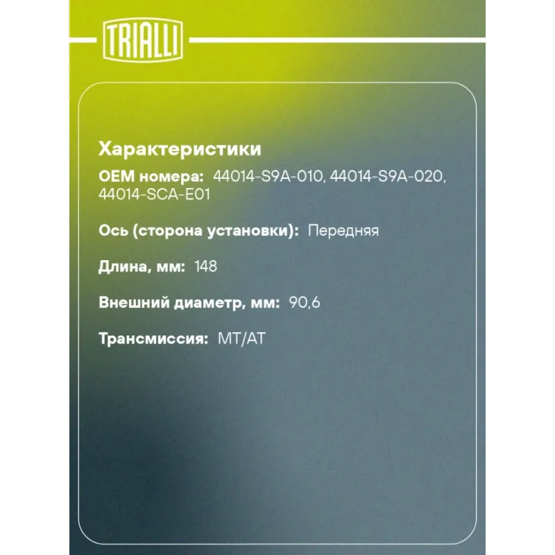 ШРУС наружный для автомобилей Honda CR-V (02-) 2.0i Характеристики: Артикул: GO 2303 OEM номера: 44014-S9A-010, 44014-S9A-020, 44014-SCA-E01 Тип КПП: MT Гарантийный срок: 2 года/60 000 км Материал пыльника: CR Количество на автомобиль: 2 Ось (сторона установки): передняя Длина, мм: 148 Внешнее зубчатое соединение со стороны колеса (внеш.): 28 Внутреннее зубчатое соединение со стороны колеса (внеш.): 32 Наличие/Отсутвие ABS: отсут Внешний диаметр, мм: 90,6 Размер резьбы: М22*1,5 Сопутствующий товар: Приводы: AR 2317, AR 2323, AR 2318, AR 2324 Сопутствующий товар: Ремонтные комплекты ШРУСов: FG 2310, FG 2306 Сопутствующий товар: ШРУСы: GO 2312, GO 2316 Товарная линейка: BLACK Трансмиссия: MT/АТ Подходит для авто: Honda CR-V II (02-), Accord (02-) Для проверки применяемости отправьте VIN автомобиля через вкладку "Есть вопросы о товаре?" Комплектация: ШРУС - 1 шт Чехол ШРУСа - 1 шт Хомут - 2 шт Стопорное кольцо - 1 шт Гайка - 1 шт Смазка - 1 шт Гарантия: от 1 года.