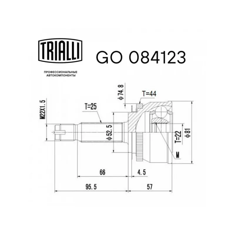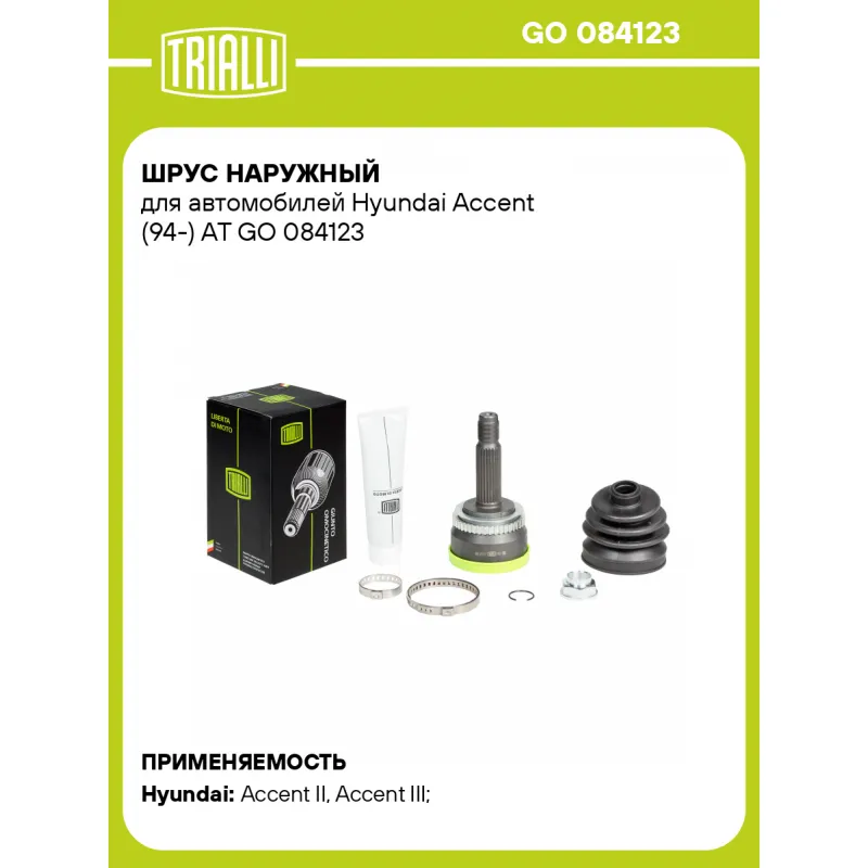 ШРУС наружный для автомобилей Hyundai Accent (94-) AT Характеристики: Артикул: GO 084123 OEM номера: 49500-25501, 49500-25510, 49500-25511, 49507-25B20, 49500-25500, 49508-25B20 Тип КПП: AT Материал пыльника: CR Количество на автомобиль: 2 Ось (сторона установки): передняя Длина, мм: 152,5 Гарантийный срок: 2 года/60 000 км Внешнее зубчатое соединение со стороны колеса (внеш.): 25 Внутреннее зубчатое соединение со стороны колеса (внеш.): 22 Наличие/Отсутвие ABS: есть Количество зубьев ABS: 44 Внешний диаметр, мм: 81 Внешений диаметр кольца ABS: 74,8 Размер резьбы: М22х1,5 Сопутствующий товар: ШРУСы: GO 0854, GO 0895 Товарная линейка: BLACK Подходит для авто: Hyundai Accent II (99-), Accent III (05-), Accent I (94-) Для проверки применяемости отправьте VIN автомобиля через вкладку "Есть вопросы о товаре?" Комплектация: ШРУС - 1 шт Чехол ШРУСа - 1 шт Хомут - 2 шт Гайка - 1 шт Стопорное кольцо - 1 шт Смазка - 1 шт Гарантия: от 1 года.