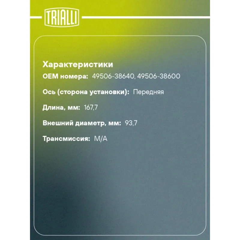ШРУС наружный для автомобилей Hyundai Sonata (01-) 2.7i ABS Характеристики: Артикул: GO 0890 OEM номера: 49506-38640, 49506-38600 Тип КПП: AT Гарантийный срок: 2 года/60 000 км Материал пыльника: CR Количество на автомобиль: 2 Ось (сторона установки): передняя Длина, мм: 167,7 Внешнее зубчатое соединение со стороны колеса (внеш.): 27 Внутреннее зубчатое соединение со стороны колеса (внеш.): 34 Наличие/Отсутвие ABS: есть Количество зубьев ABS: 47 Внешний диаметр, мм: 93,7 Внешений диаметр кольца ABS: 101,5 Размер резьбы: М22*1,5 Сопутствующий товар: Ремонтные комплекты ШРУСов: FG 0816; FG 1414 Сопутствующий товар: ШРУСы: GO 084504 Товарная линейка: BLACK Трансмиссия: M/A Подходит для авто: Hyundai Sonata IV (EF) (98-), Trajet (00-) Kia Magentis I (01-) Для проверки применяемости отправьте VIN автомобиля через вкладку "Есть вопросы о товаре?" Комплектация: ШРУС - 1 шт Пыльник - 1 шт Хомут - 2 шт Стопорное кольцо - 1 шт Шплинт - 1 шт Гайка - 1 шт Тюбик со смазкой - 1 шт Гарантийный талон - 1 шт Гарантия: от 1 года.