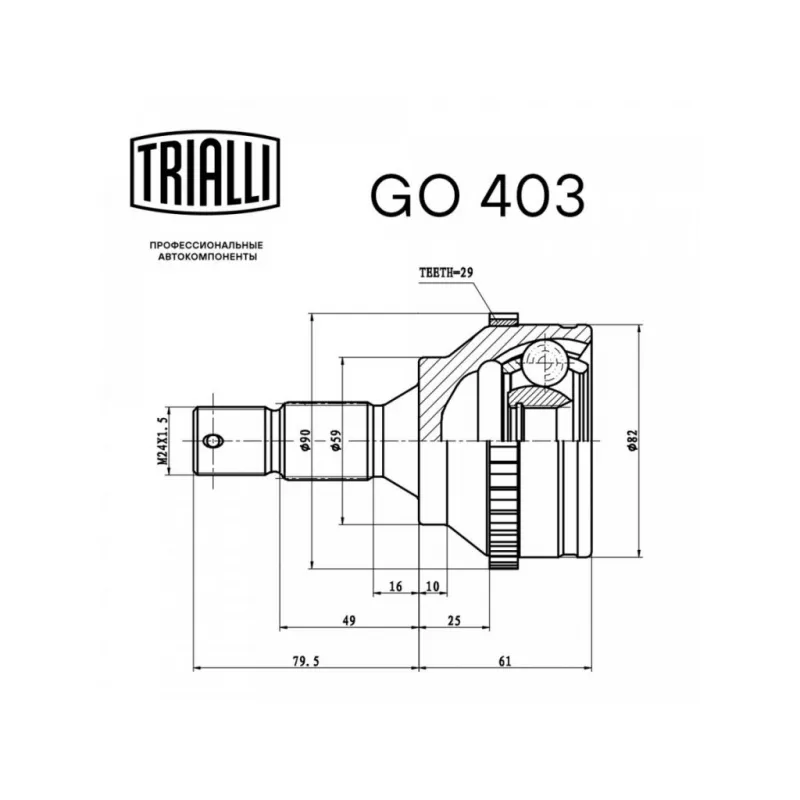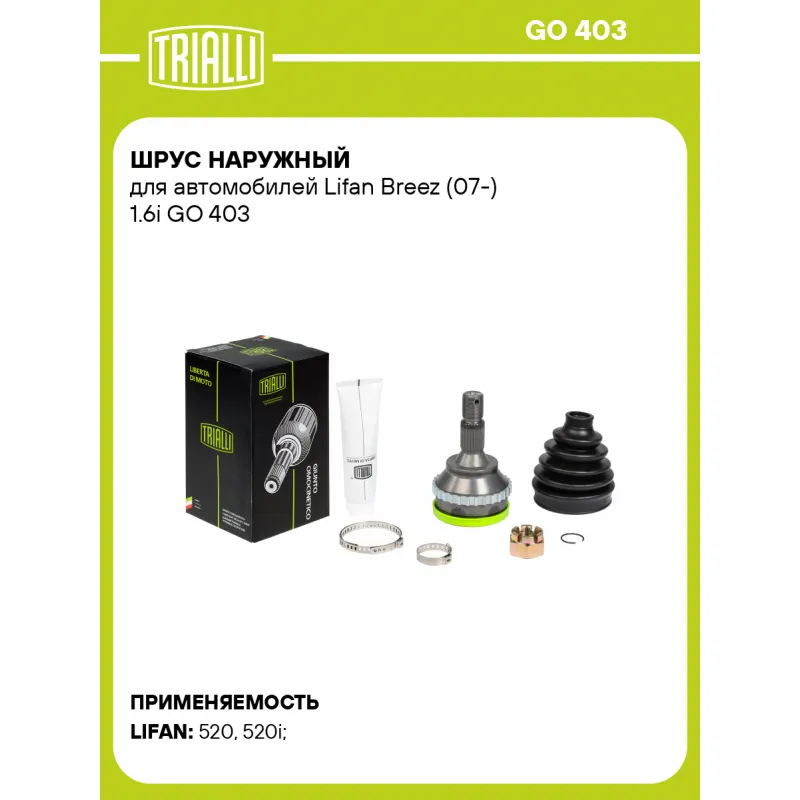 ШРУС наружный для автомобилей Lifan Breez (07-) 1.6i Характеристики: Артикул: GO 403 OEM номера: SLAL22003 Тип КПП: MT Материал пыльника: CR Количество на автомобиль: 2 Ось (сторона установки): передняя Длина, мм: 140,5 Гарантийный срок: 2 года/60 000 км Внешнее зубчатое соединение со стороны колеса (внеш.): 25 Внутреннее зубчатое соединение со стороны колеса (внеш.): 30 Наличие/Отсутвие ABS: есть Количество зубьев ABS: 29 Внешний диаметр, мм: 82 Внешений диаметр кольца ABS: 90 Размер резьбы: М24х1.5 Товарная линейка: BLACK Комплектация: ШРУС - 1 шт Чехол ШРУСа - 1 шт Хомут - 2 шт Стопорное кольцо - 1 шт Гайка - 1 шт Тюбик со смазкой - 1 шт Гарантия: от 1 года.