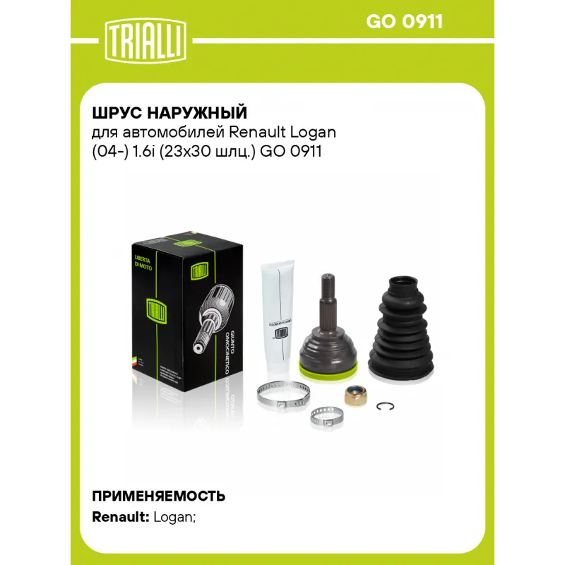 ШРУС наружный для автомобилей Renault Logan (04-) 1.6i (23х30 шлц.) Характеристики: Артикул: GO 0911 OEM номера: 8200499306, 7711497480, 39 10 177 23R, 7711497479, 82 00 499 304 Тип КПП: MT Материал пыльника: CR Количество на автомобиль: 2 Сопутствующие товары:: AR 0901, AR 0902, FG 0911, GO 0913, GO 0912 Ось (сторона установки): передняя Длина, мм: 145 Гарантийный срок: 2 года/60 000 км Внешнее зубчатое соединение со стороны колеса (внеш.): 23 Внутреннее зубчатое соединение со стороны колеса (внеш.): 30 Наличие/Отсутвие ABS: отсут Внешний диаметр, мм: 84 Размер резьбы: М20х1,5 Особенности конструкции:: имульсное кольцо ABS выполено в ступичном подшипнике Сопутствующий товар: Приводы: AR 0901; AR 095151; AR 095152, AR 0949 Сопутствующий товар: Ремонтные комплекты ШРУСов: FG 0905; FG 0909; FG 0910; FG 0911; FG 0915; FG 2305; RG 0930; RG 0931 Сопутствующий товар: ШРУСы: GO 0908; GO 0909; GO 0910; GO 0912; GO 0913 Товарная линейка: BLACK Подходит для авто: Renault Logan (04-) Для проверки применяемости отправьте VIN автомобиля через вкладку "Есть вопросы о товаре?" Комплектация: ШРУС - 1 шт Пыльник - 1 шт Стопорное кольцо - 1 шт Хомут - 2 шт Гайка - 1 шт Тюбик со смазкой - 1 шт Гарантийный талон - 1 шт Гарантия: от 1 года.