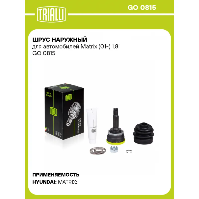 ШРУС наружный для автомобилей Matrix (01-) 1.8i Характеристики: Артикул: GO 0815 OEM номера: 49501-17250, 49500-17250 Тип КПП: MT/AT Материал пыльника: CR Количество на автомобиль: 2 Ось (сторона установки): передняя Длина, мм: 155,5 Гарантийный срок: 2 года/60 000 км Внешнее зубчатое соединение со стороны колеса (внеш.): 25 Внутреннее зубчатое соединение со стороны колеса (внеш.): 23 Наличие/Отсутвие ABS: есть Количество зубьев ABS: 44 Внешний диаметр, мм: 83 Размер резьбы: М22х1,5 Товарная линейка: BLACK Комплектация: ШРУС - 1 шт Пыльник - 1 шт Хомут - 2 шт Стопорное кольцо - 1 шт Гайка - 1 шт Шплинт - 1 шт Тюбик со смазкой - 1 шт Гарантийный талон - 1 шт Гарантия: от 1 года.