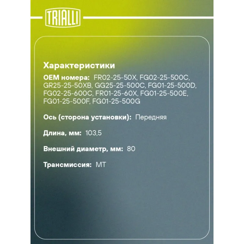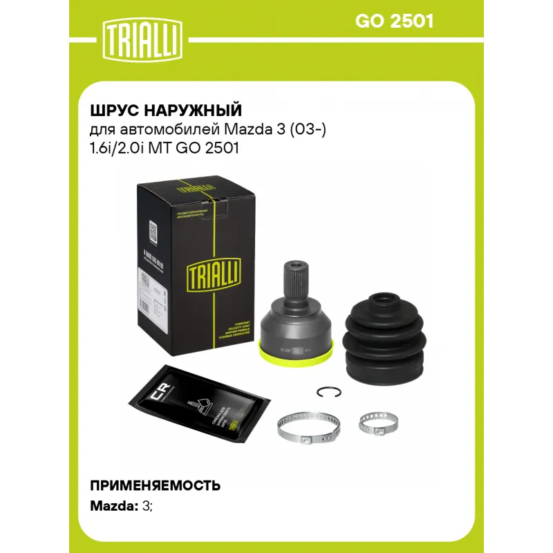 ШРУС наружный для автомобилей Mazda 3 (03-) 1.6i/2.0i MT Характеристики: Артикул: GO 2501 OEM номера: FR02-25-50X, FG02-25-500C, GR25-25-50XB, GG25-25-500C, FG01-25-500D, FG02-25-600C, FR01-25-60X, FG01-25-500E, FG01-25-500F, FG01-25-500G, FG01-25-600D, FG01-25-600E, FG01-25-600F, FG07-25-600A, FR01-25-50X, GG25-25-500D, GG25-25-500E, GG25-25-600C, GG25-25-600D, GG25-25-600E, GR25-25-60XB Тип КПП: MT Гарантийный срок: 2 года/60 000 км Материал пыльника: CR Количество на автомобиль: 2 Ось (сторона установки): передняя Длина, мм: 103,5 Внешнее зубчатое соединение со стороны колеса (внеш.): 36 Внутреннее зубчатое соединение со стороны колеса (внеш.): 22 Внешний диаметр, мм: 80 Размер резьбы: 10х1,5-6H Сопутствующий товар: Ремонтные комплекты ШРУСов: FG 0808; FG 2503 Сопутствующий товар: ШРУСы: GO 2502; GO 2503; GO 2504; GO 2505; GO 2506; GO 2507; GO 2521; GO 2522; GO 2524; GO 808; GO 816 Товарная линейка: BLACK Трансмиссия: МТ Подходит для авто: Mazda 3 (03-) Для проверки применяемости отправьте VIN автомобиля через вкладку "Есть вопросы о товаре?" Комплектация: ШРУС - 1 шт Чехол ШРУСа - 1 шт Хомут - 2 шт Стопорное кольцо - 1 шт Смазка - 1 шт Гарантия: от 1 года.