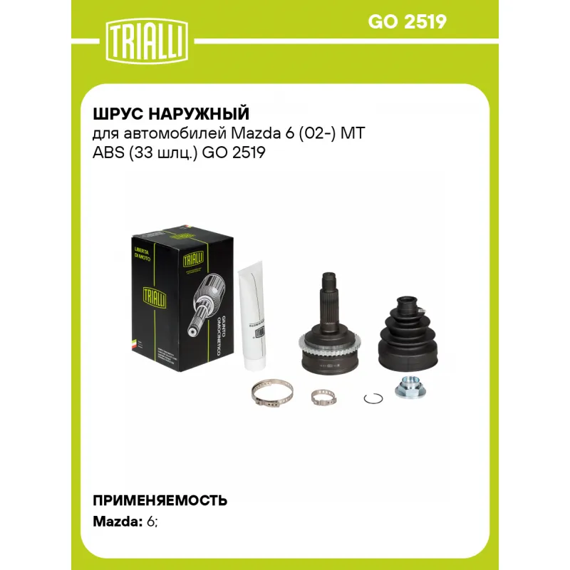 ШРУС наружный для автомобилей Mazda 6 (02-) MT ABS (33 шлц.) Характеристики: Артикул: GO 2519 OEM номера: GD62-25-50X, GD622550XC, GD38-22-510A, GD4022510, GD402550XA, GD60-25-60XB, GD382550X, GD40-22-510A, GD402550XB, GD62-25-60XD, GD382550XA, GD40-22-610, GD402550XC, GD62-25-50XA, GD38-25-60XB, GD40-22-610A, GD60-25-60XA, GD622550XB Тип КПП: MT Материал пыльника: CR Количество на автомобиль: 2 Ось (сторона установки): передняя, правая Длина, мм: 148 Гарантийный срок: 2 года/60 000 км Внешнее зубчатое соединение со стороны колеса (внеш.): 28 Внутреннее зубчатое соединение со стороны колеса (внеш.): 33 Наличие/Отсутвие ABS: есть Количество зубьев ABS: 44 Внешний диаметр, мм: 89,4 Внешений диаметр кольца ABS: 96,6 Размер резьбы: 22х1,5 Сопутствующий товар: Ремонтные комплекты ШРУСов: FG 1012 Сопутствующий товар: ШРУСы: GO 2518 Товарная линейка: BLACK Трансмиссия: MT Подходит для авто: Mazda 6 (02-) Для проверки применяемости отправьте VIN автомобиля через вкладку "Есть вопросы о товаре?" Комплектация: ШРУС - 1 шт Чехол ШРУСа - 1 шт Хомут - 2 шт Гайка - 1 шт Стопорное кольцо - 1 шт Тюбик со смазкой - 1 шт Гарантийный талон - 1 шт Гарантия: от 1 года.