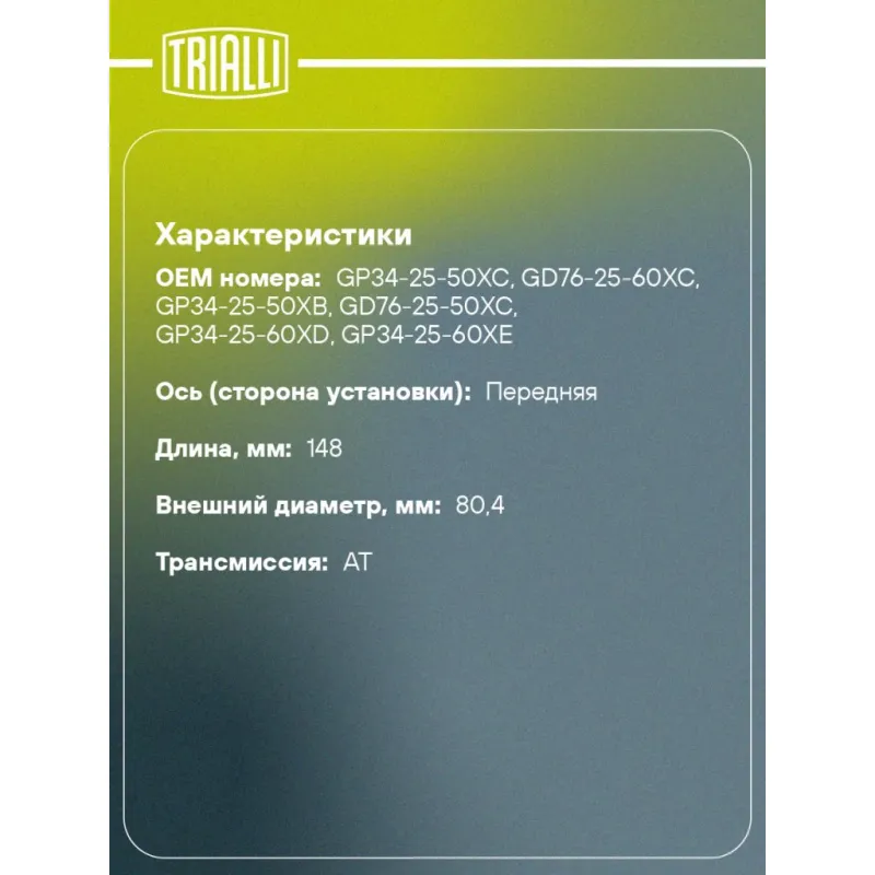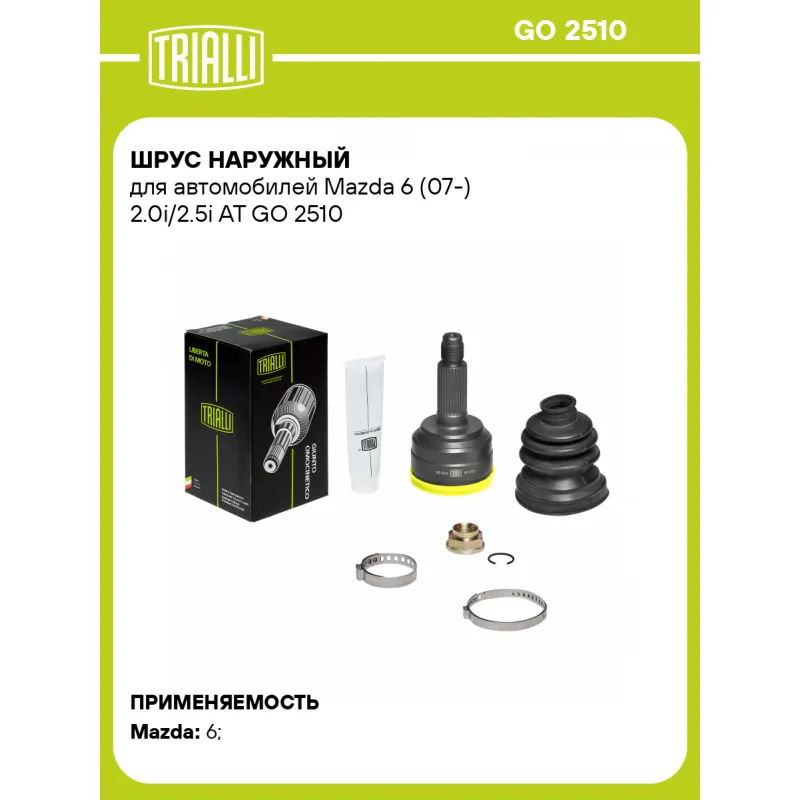 ШРУС наружный для автомобилей Mazda 6 (07-) 2.0i/2.5i AT Характеристики: Артикул: GO 2510 OEM номера: GP34-25-50XC, GD76-25-60XC, GP34-25-50XB, GD76-25-50XC, GP34-25-60XD, GP34-25-60XE Тип КПП: AT Гарантийный срок: 2 года/60 000 км Количество на автомобиль: 2 Ось (сторона установки): передняя Длина, мм: 148 Внешнее зубчатое соединение со стороны колеса (внеш.): 28 Внутреннее зубчатое соединение со стороны колеса (внеш.): 33 Внешний диаметр, мм: 80,4 Размер резьбы: 22х1,5 Сопутствующий товар: Ремонтные комплекты ШРУСов: FG 1012; FG 2502 Сопутствующий товар: ШРУСы: GO 2511; GO 2512; GO 2517 Материал пыльника: CR Товарная линейка: BLACK Трансмиссия: AT Подходит для авто: Mazda 6 (07-) Для проверки применяемости отправьте VIN автомобиля через вкладку "Есть вопросы о товаре?" Комплектация: Стопорное кольцо - 1 шт Гайка - 1 шт Хомут - 2 шт Тюбик со смазкой - 1 шт Пыльник - 1 шт ШРУС наружный - 1 шт Гарантийный талон - 1 шт Гарантия: от 1 года.