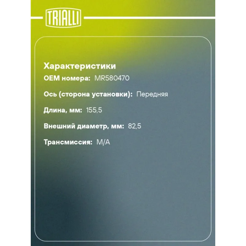 ШРУС наружный для автомобилей Mitsubishi Outlander (03-) 2.0i Характеристики: Артикул: GO 1106 OEM номера: MR580470 Тип КПП: AT Гарантийный срок: 2 года/60 000 км Материал пыльника: CR Количество на автомобиль: 2 Ось (сторона установки): передняя Длина, мм: 155,5 Внешнее зубчатое соединение со стороны колеса (внеш.): 25 Внутреннее зубчатое соединение со стороны колеса (внеш.): 33 Наличие/Отсутвие ABS: есть Количество зубьев ABS: 43 Внешний диаметр, мм: 82,5 Размер резьбы: 22х1,5-6g Сопутствующий товар: Ремонтные комплекты ШРУСов: FG 1103; FG 2505 Товарная линейка: BLACK Трансмиссия: M/A Подходит для авто: Mitsubishi Outlander I (03-) Для проверки применяемости отправьте VIN автомобиля через вкладку "Есть вопросы о товаре?" Комплектация: ШРУС - 1 шт Пыльник - 1 шт Хомут - 2 шт Стопорное кольцо - 1 шт Гайка - 1 шт Тюбик со смазкой - 1 шт Гарантийный талон - 1 шт Гарантия: от 1 года.