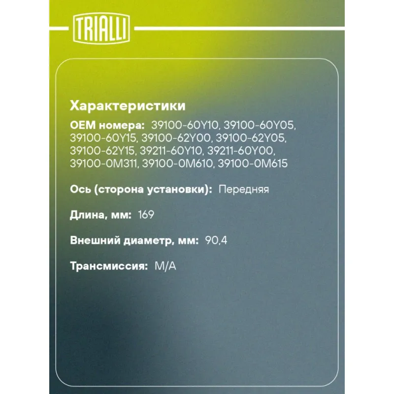ШРУС наружный для автомобилей Nissan Almera N16 (00-) ABS Характеристики: Артикул: GO 1401 OEM номера: 39100-60Y10, 39100-60Y05, 39100-60Y15, 39100-62Y00, 39100-62Y05, 39100-62Y15, 39211-60Y10, 39211-60Y00, 39100-0M311, 39100-0M610, 39100-0M615, 39100-0M910, 39100-0M915, 39100-40Y10, 39100-4M776, 39100-61Y16, 39100-63Y10, 39100-6N215, 39101-0M311, 39101-0M910, 39101-0M915, 39101-0N510, 39101-1N515, 39101-40Y10, 39101-4M771, 39101-60Y10, 39101-60Y15, 39101-61Y17, 39101-62Y15, 39101-62Y16, 39101-63Y10, 39101-63Y15, 39101-6N215, 39100-0M301, 39100-0M306, 39100-0M600, 39100-0M605, 39100-0M900, 39100-0M905, 39100-40Y00, 39100-40Y06, 39100-61Y06, 39100-63Y00, 39100-63Y01, 39101-0M306, 39101-0M600, 39101-0M605, 39101-40Y00, 39101-40Y06, 39101-60Y00, 39101-60Y05, 39101-61Y07, 39101-62Y05, 39101-63Y00, 39101-63Y01, 39101-63Y05 Тип КПП: MT/AT Материал пыльника: CR Количество на автомобиль: 2 Ось (сторона установки): передняя Длина, мм: 169 Гарантийный срок: 2 года/60 000 км Внешнее зубчатое соединение со стороны колеса (внеш.): 25 Внутреннее зубчатое соединение со стороны колеса (внеш.): 23 Наличие/Отсутвие ABS: есть Количество зубьев ABS: 42 Внешний диаметр, мм: 90,4 Размер резьбы: 22х1,5 Сопутствующий товар: Ремонтные комплекты ШРУСов: FG 0520 Товарная линейка: BLACK Трансмиссия: M/A Подходит для авто: Nissan Almera N15 (95-), Almera N15 (95-) Для проверки применяемости отправьте VIN автомобиля через вкладку "Есть вопросы о товаре?" Комплектация: ШРУС - 1 шт Чехол ШРУСа - 1 шт Хомут - 2 шт Стопорное кольцо - 1 шт Шплинт - 1 шт Гайка - 1 шт Смазка - 1 туба Гарантия: от 1 года.