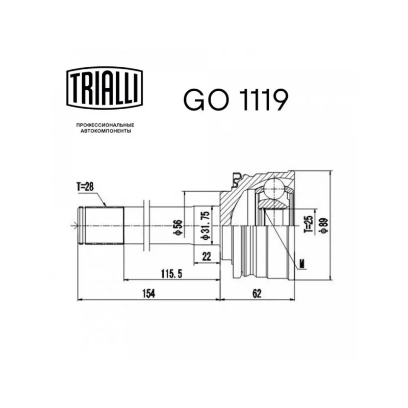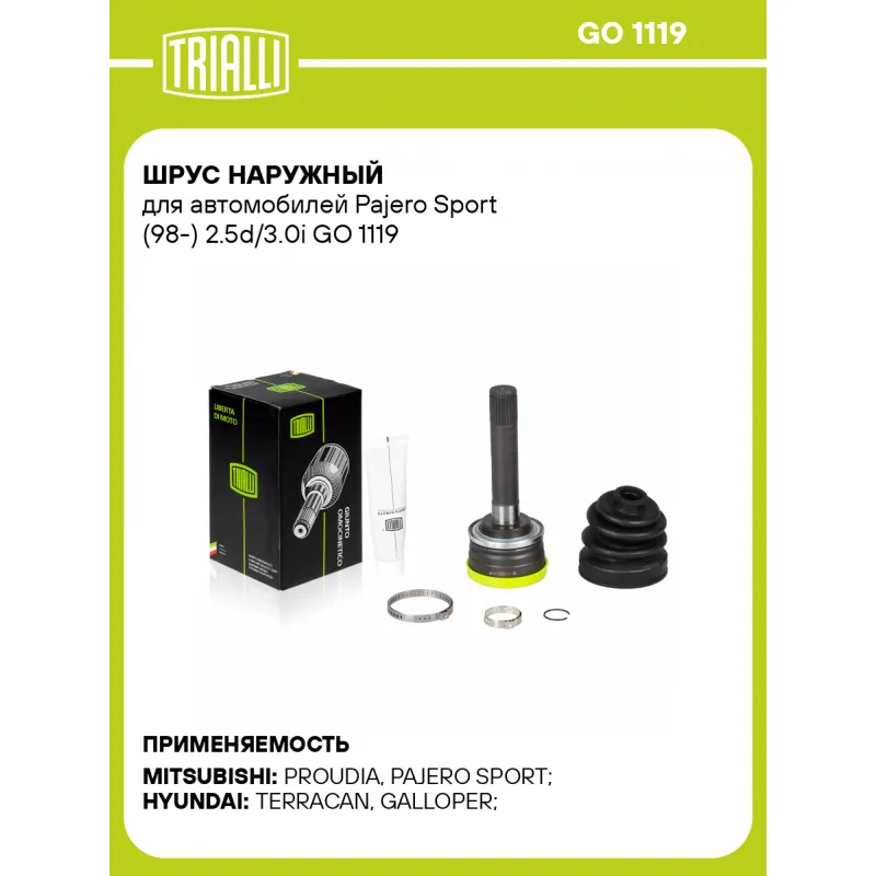 ШРУС наружный для автомобилей Pajero Sport (98-) 2.5d/3.0i Характеристики: Артикул: GO 1119 OEM номера: MR276871, MB526272, MB620834, MR276860, MB526145, MR276870, MB526271, MR276874, MB620833, MR276859, MR276869, MB526270, 51610-H1020, 51620-H1020, RR276871G, MB 526141, MB 526142, MB 620251, MB 620252, MB 620253, MB 620625, MB 886761, MR 111573, MR 111574 Тип КПП: MT Материал пыльника: CR Количество на автомобиль: 2 Ось (сторона установки): передняя Длина, мм: 216 Гарантийный срок: 2 года/60 000 км Внешнее зубчатое соединение со стороны колеса (внеш.): 28 Внутреннее зубчатое соединение со стороны колеса (внеш.): 25 Внешний диаметр, мм: 89 Сопутствующий товар: Ремонтные комплекты ШРУСов: FG 1103 Сопутствующий товар: ШРУСы: GO 1128, GO 1127 Товарная линейка: BLACK Комплектация: ШРУС - 1 шт Чехол ШРУСа - 1 шт Хомут - 2 шт Стопорное кольцо - 1 шт Смазка - 1 шт Гарантия: от 1 года.