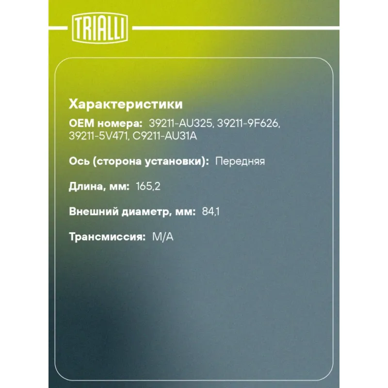ШРУС наружный для автомобилей Primera P12 (02-) ABS Характеристики: Артикул: GO 1404 OEM номера: 39211-AU325, 39211-9F626, 39211-5V471, C9211-AU31A Тип КПП: MT/AT Гарантийный срок: 2 года/60 000 км Материал пыльника: CR Количество на автомобиль: 2 Ось (сторона установки): передняя Длина, мм: 165,2 Внешнее зубчатое соединение со стороны колеса (внеш.): 27 Внутреннее зубчатое соединение со стороны колеса (внеш.): 23 Наличие/Отсутвие ABS: есть Количество зубьев ABS: 44 Внешний диаметр, мм: 84,1 Размер резьбы: 24х1,5 Сопутствующий товар: Ремонтные комплекты ШРУСов: FG 0520 Сопутствующий товар: ШРУСы: GO 1435 Товарная линейка: BLACK Трансмиссия: M/A Подходит для авто: Nissan Primera P12 (02-) Для проверки применяемости отправьте VIN автомобиля через вкладку "Есть вопросы о товаре?" Комплектация: ШРУС - 1 шт Чехол ШРУСа - 1 шт Хомут - 2 шт Стопорное кольцо - 1 шт Гайка - 1 шт Шплинт - 1 шт Контровочная шайба - 1 шт Смазка - 1 шт Гарантия: от 1 года.