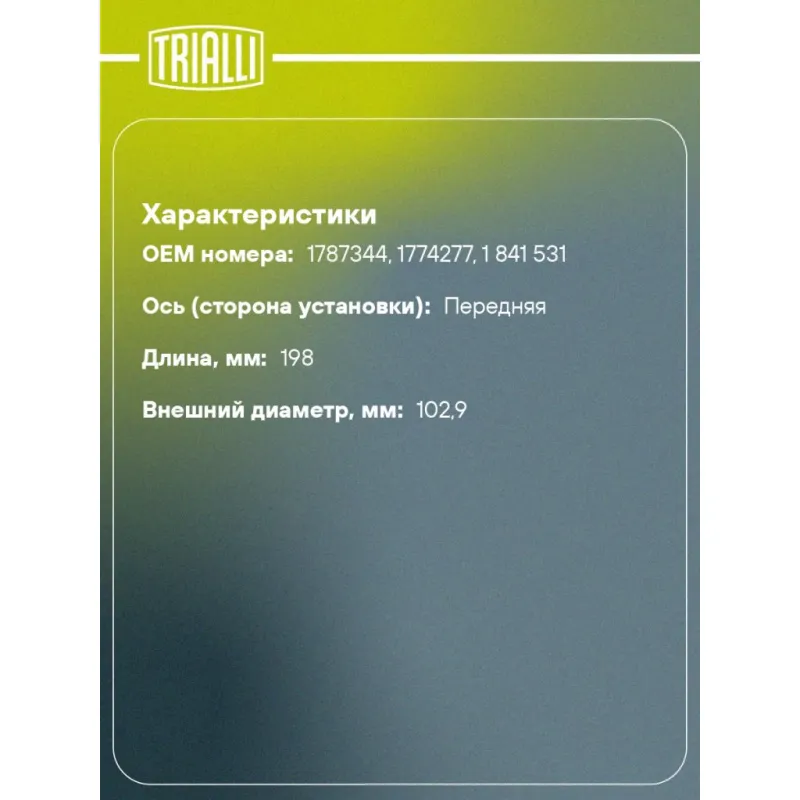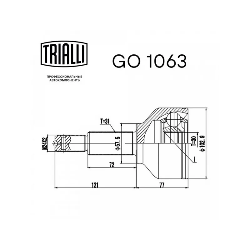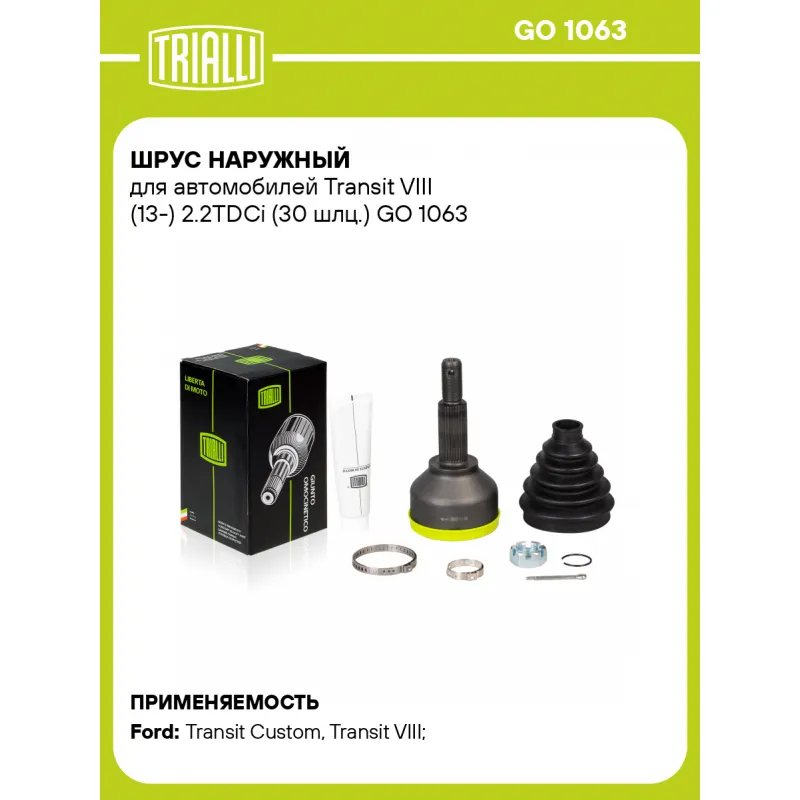 ШРУС наружный для автомобилей Transit VIII (13-) 2.2TDCi (30 шлц.) Характеристики: Артикул: GO 1063 OEM номера: 1787344, 1774277, 1 841 531 Тип КПП: MT Материал пыльника: CR Количество на автомобиль: 2 Ось (сторона установки): передняя Длина, мм: 198 Гарантийный срок: 2 года/60 000 км Внешнее зубчатое соединение со стороны колеса (внеш.): 31 Внутреннее зубчатое соединение со стороны колеса (внеш.): 30 Внешний диаметр, мм: 102,9 Размер резьбы: М24х2 Сопутствующий товар: Приводы: AR 1051, AR 1052 Сопутствующий товар: Ремонтные комплекты ШРУСов: FG 1026 Товарная линейка: BLACK Подходит для авто: Ford Transit Custom (12-), Transit VIII (13-) Для проверки применяемости отправьте VIN автомобиля через вкладку "Есть вопросы о товаре?" Комплектация: ШРУС - 1 шт Чехол ШРУСа - 1 шт Хомут - 2 шт Стопорное кольцо - 1 шт Гайка - 1 шт Шплинт - 1 шт Смазка - 1 шт Гарантия: от 1 года.