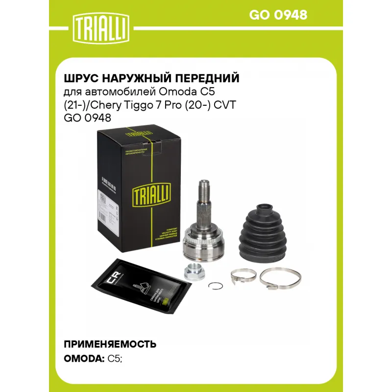 ШРУС наружный передний для автомобилей Omoda C5 (21-)/Chery Tiggo 7 Pro (20-) CVT Характеристики: Артикул: GO 0948 OEM номера: 154000420AA, 154000419AA Ось (сторона установки): передняя Длина, мм: 162 Внешний диаметр, мм: 88 Размер резьбы: М24х1,5 Количество зубьев ABS: 48 Внешений диаметр кольца ABS: 80 Внешнее зубчатое соединение со стороны колеса (внеш.): 28 Внутреннее зубчатое соединение со стороны колеса (внеш.): 33 Тип КПП: CVT Гарантийный срок: 2 года/60 000 км Сопутствующий товар: ШРУСы: GO 0949 Сопутствующий товар: Приводы: AR 2737, AR 2738 Материал пыльника: CR Количество на автомобиль: 2 Товарная линейка: BLACK Комплектация: ШРУС - 1 шт Чехол ШРУСа - 1 шт Хомут - 2 шт Стопорное кольцо - 1 шт Гайка - 1 шт Смазка - 1 туба Гарантия: от 1 года.