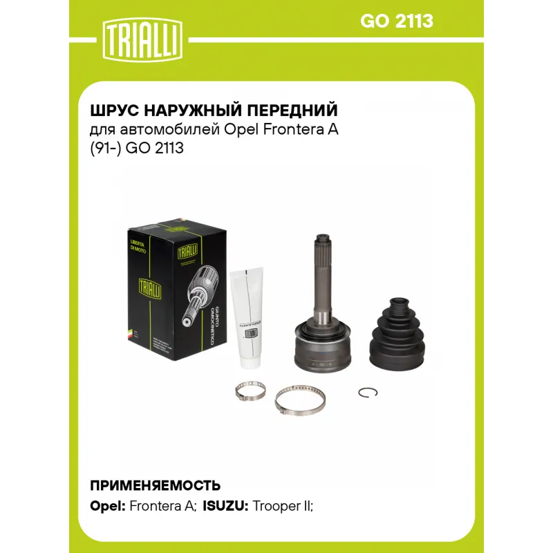 ШРУС наружный передний для автомобилей Opel Frontera A (91-) Характеристики: Артикул: GO 2113 OEM номера: 97131395, 0374280, 8-94173-304-3, 8-94453-693-3, 8-97016-098-0, 8-97063-620-0, 8-97065-119-0, 8-97120-778-0, 8-97139-092-1, 8-94173-305-3, 8-94453-693-4, 8-97016-098-2, 8-97063-621-0, 8-97109-762-0, 8-97139-091-0, 8-97361-347-0, 8-94374-779-1, 8-94453-694-3, 8-97016-099-0, 8-97063-622-0, 8-97120-776-0, 8-97139-091-1, 8-97361-348-0, 8-94374-780-1, 8-94453-694-4, 8-97016-099-2, 8-97063-623-0, 8-97120-777-0, 8-97139-092-0 Тип КПП: MT Материал пыльника: CR Количество на автомобиль: 2 Ось (сторона установки): передняя Длина, мм: 214,5 Гарантийный срок: 2 года/60 000 км Внешнее зубчатое соединение со стороны колеса (внеш.): 17 Внутреннее зубчатое соединение со стороны колеса (внеш.): 26 Наличие/Отсутвие ABS: отсут Внешний диаметр, мм: 94,8 Размер резьбы: М8х1,25 Сопутствующий товар: ШРУСы: GO 2011 Товарная линейка: BLACK Подходит для авто: Opel Frontera A (91-) ISUZU Trooper II (91-) Для проверки применяемости отправьте VIN автомобиля через вкладку "Есть вопросы о товаре?" Комплектация: ШРУС - 1 шт Чехол ШРУСа - 1 шт Хомут - 2 шт Стопорное кольцо - 1 шт Смазка - 1 шт Гарантия: от 1 года.