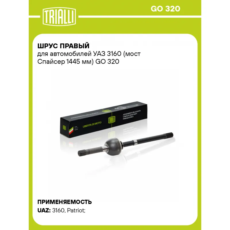 ШРУС правый для автомобилей УАЗ 3160 (мост Спайсер 1445 мм) Характеристики: Артикул: GO 320 OEM номера: 3160-2304060 Тип КПП: MT Гарантийный срок: 2 года/60 000 км Материал пыльника: CR Парный товар: GO 321 Количество на автомобиль: 1 Сопутствующие товары:: GO 284,GO 422,GO 423,FG 284 Ось (сторона установки): передняя, правая Длина, мм: 627 Внешнее зубчатое соединение со стороны КПП (внутр.): 10 Внутреннее зубчатое соединение со стороны привода (внутр.): 36 Внешнее зубчатое соединение со стороны колеса (внеш.): 10 Внешний диаметр, мм: 96 Размер резьбы: М12-6H Особенности конструкции:: (мост Спайсер 1445 мм) Сопутствующий товар: ШРУСы: GO 310; GO 311; GO 321; GO 350; GO 351 Товарная линейка: BLACK Подходит для авто: УАЗ 3160 (97-), 3160 (97-), Patriot (97-), 3160 (97-), Patriot (97-), Patriot (97-) Для проверки применяемости отправьте VIN автомобиля через вкладку "Есть вопросы о товаре?" Комплектация: ШРУС правый - 1 шт Гарантийный талон - 1 шт Гарантия: от 1 года.