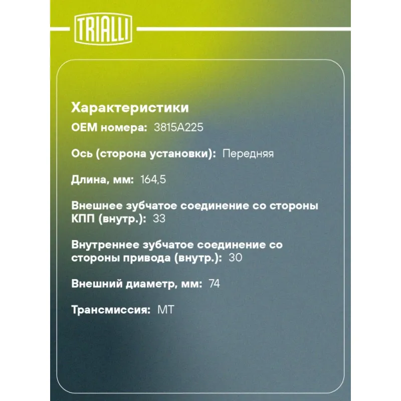 ШРУС внутренний для автомобилей Colt (04-) 1.5i MT Характеристики: Артикул: GO 1115 OEM номера: 3815A225 Тип КПП: MT Гарантийный срок: 2 года/60 000 км Материал пыльника: CR Количество на автомобиль: 2 Ось (сторона установки): передняя Длина, мм: 164,5 Внешнее зубчатое соединение со стороны КПП (внутр.): 33 Внутреннее зубчатое соединение со стороны привода (внутр.): 30 Внешний диаметр, мм: 74 Сопутствующий товар: ШРУСы: GO 1129 Товарная линейка: BLACK Трансмиссия: MT Подходит для авто: Mitsubishi Colt (04-) Для проверки применяемости отправьте VIN автомобиля через вкладку "Есть вопросы о товаре?" Комплектация: ШРУС - 1 шт Пыльник - 1 шт Хомут - 2 шт Тюбик со смазкой - 1 шт Гарантийный талон - 1 шт Гарантия: от 1 года.