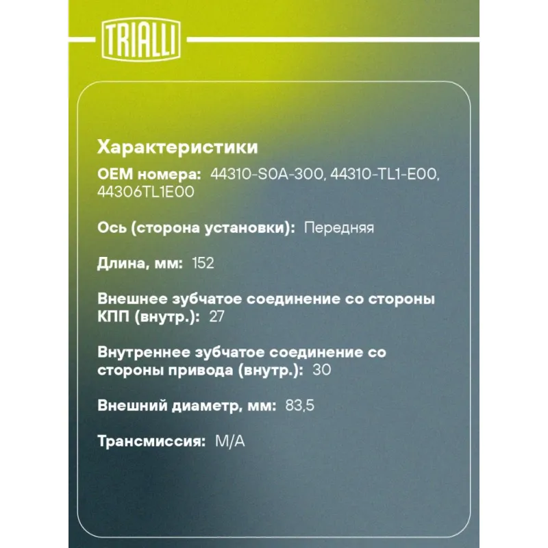 ШРУС внутренний для автомобилей Honda Civic (05-) 1.8i MT Характеристики: Артикул: GO 2304 OEM номера: 44310-S0A-300, 44310-TL1-E00, 44306TL1E00 Тип КПП: MT Гарантийный срок: 2 года/60 000 км Материал пыльника: CR Количество на автомобиль: 2 Ось (сторона установки): передняя Длина, мм: 152 Внешнее зубчатое соединение со стороны КПП (внутр.): 27 Внутреннее зубчатое соединение со стороны привода (внутр.): 30 Внешний диаметр, мм: 83,5 Сопутствующий товар: Приводы: AR 2331 Сопутствующий товар: Ремонтные комплекты ШРУСов: FG 2301; FG 2305; FG 2306; FG 2309; FG 2310; FG 2313 Сопутствующий товар: ШРУСы: GO 2301; GO 2302; GO 2303; GO 2306; GO 2312; GO 2313; GO 2316 Товарная линейка: BLACK Трансмиссия: M/A Подходит для авто: Honda Accord (02-), Accord (08-), Civic VIII (06-), Civic VII (00-), HR-V I (98-), Stream I (00-) Для проверки применяемости отправьте VIN автомобиля через вкладку "Есть вопросы о товаре?" Комплектация: Пыльник - 1 шт Тюбик со смазкой - 1 шт ШРУС - 1 шт Хомут - 2 шт Стопорное кольцо - 1 шт Гарантия: от 1 года.