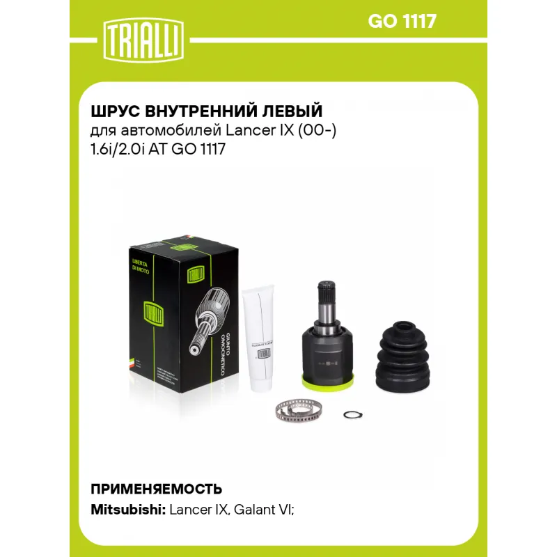 ШРУС внутренний левый для автомобилей Lancer IX (00-) 1.6i/2.0i AT Характеристики: Артикул: GO 1117 OEM номера: MN147089, MR980002, 3817A004, MN 147087, MN 147159, MR 276445, MR 331245 Тип КПП: AT Материал пыльника: CR Количество на автомобиль: 2 Ось (сторона установки): передняя Длина, мм: 159,8 Внешнее зубчатое соединение со стороны КПП (внутр.): 25 Гарантийный срок: 2 года/60 000 км Внутреннее зубчатое соединение со стороны привода (внутр.): 30 Внешний диаметр, мм: 78,5 Сопутствующий товар: Ремонтные комплекты ШРУСов: FG 2305 Сопутствующий товар: ШРУСы: GO 1101, GO 1120 Товарная линейка: BLACK Подходит для авто: Mitsubishi Lancer IX (03-), Galant VI (96-) Для проверки применяемости отправьте VIN автомобиля через вкладку "Есть вопросы о товаре?" Комплектация: ШРУС - 1 шт Пыльник - 1 шт Хомут - 2 шт Стопорное кольцо - 1 шт Тюбик со смазкой - 1 шт Гарантия: от 1 года.