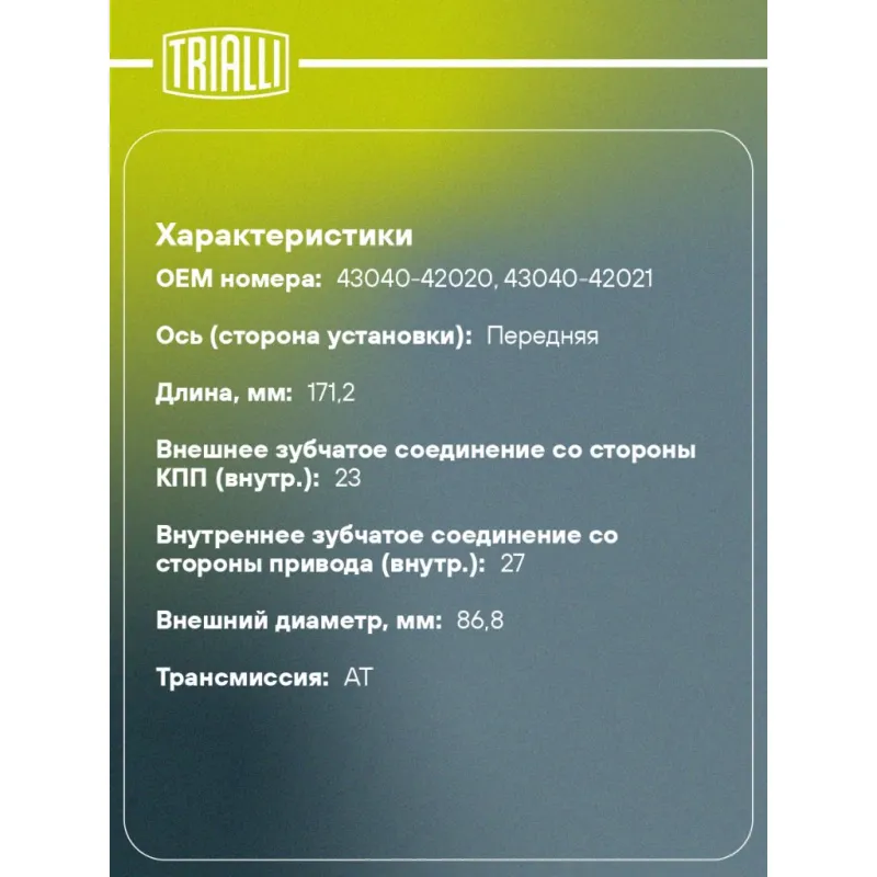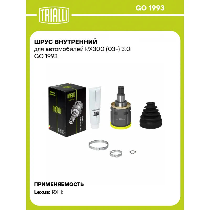 ШРУС внутренний для автомобилей RX300 (03-) 3.0i Характеристики: Артикул: GO 1993 OEM номера: 43040-42020, 43040-42021 Тип КПП: MT/AT Гарантийный срок: 2 года/60 000 км Материал пыльника: CR Количество на автомобиль: 2 Ось (сторона установки): передняя Длина, мм: 171,2 Внешнее зубчатое соединение со стороны КПП (внутр.): 23 Внутреннее зубчатое соединение со стороны привода (внутр.): 27 Внешний диаметр, мм: 86,8 Сопутствующий товар: Ремонтные комплекты ШРУСов: FG 1901 Сопутствующий товар: ШРУСы: GO 128201, GO 1994 Товарная линейка: BLACK Трансмиссия: AT Подходит для авто: Lexus RX II (03-) Для проверки применяемости отправьте VIN автомобиля через вкладку "Есть вопросы о товаре?" Комплектация: ШРУС - 1 шт Пыльник - 1 шт Хомут - 2 шт Стопорное кольцо - 1 шт Тюбик со смазкой - 1 шт Гарантийный талон - 1 шт Гарантия: от 1 года.