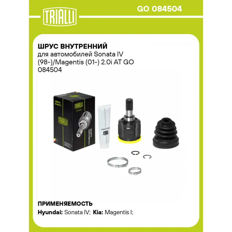 ШРУС внутренний для автомобилей Sonata IV (98-)/Magentis (01-) 2.0i AT Характеристики: Артикул: GO 084504 OEM номера: 49505-38C00, 49505-38A00 Тип КПП: AT Гарантийный срок: 2 года/60 000 км Материал пыльника: CR Количество на автомобиль: 2 Ось (сторона установки): передняя Длина, мм: 153 Внешнее зубчатое соединение со стороны КПП (внутр.): 25 Внутреннее зубчатое соединение со стороны привода (внутр.): 23 Внешний диаметр, мм: 82 Особенности конструкции:: трипойд Сопутствующий товар: ШРУСы: GO 084501, GO 0886 Товарная линейка: BLACK Подходит для авто: Hyundai Sonata IV (EF) (98-) Kia Magentis I (01-) Для проверки применяемости отправьте VIN автомобиля через вкладку "Есть вопросы о товаре?" Комплектация: ШРУС - 1 шт Пыльник - 1 шт Хомут - 2 шт Стопорное кольцо - 1 шт Тюбик со смазкой - 1 шт Гарантийный талон - 1 шт Гарантия: от 1 года.