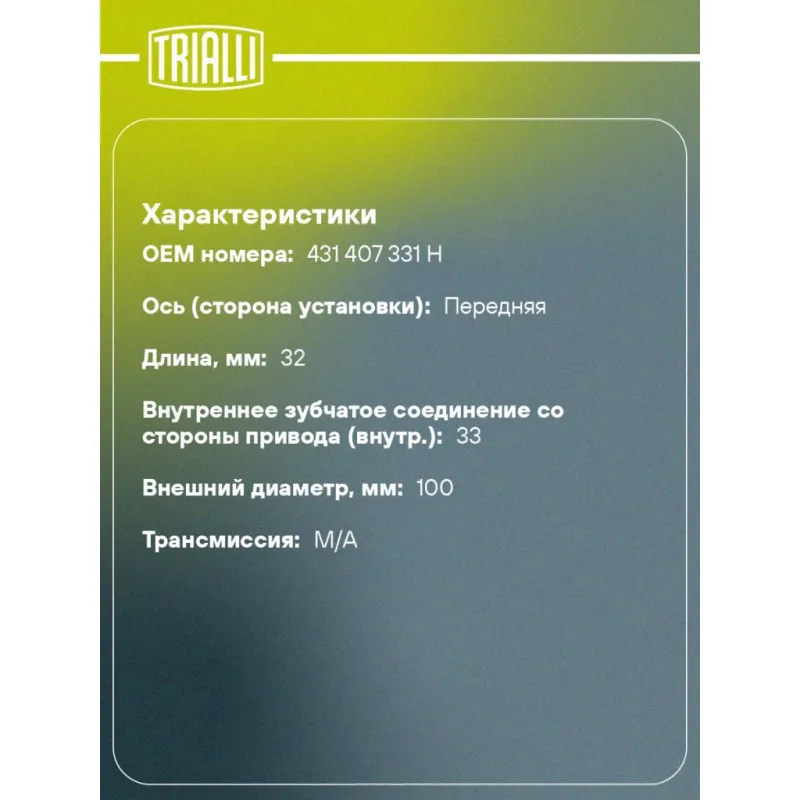 ШРУС внутренний для автомобилей Volkswagen Passat B5 (96-) Характеристики: Артикул: GO 139302 OEM номера: 431 407 331 H Тип КПП: MT Материал пыльника: CR Количество на автомобиль: 2 Ось (сторона установки): передняя Длина, мм: 32 Гарантийный срок: 2 года/60 000 км Внутреннее зубчатое соединение со стороны привода (внутр.): 33 Внешний диаметр, мм: 100 Сопутствующий товар: Приводы: AR 139352, AR 139351 Сопутствующий товар: Ремонтные комплекты ШРУСов: FG 1805, FG 1807 Сопутствующий товар: ШРУСы: GO 139301 Товарная линейка: BLACK Трансмиссия: M/A ABS: +/- Подходит для авто: Volkswagen Passat B5 (96-) Audi 100 (82-), 80 (91-), A4 B5 (94-), A4 B6 (00-), A6 C5 (97-) Для проверки применяемости отправьте VIN автомобиля через вкладку "Есть вопросы о товаре?" Комплектация: ШРУС - 1 шт Пыльник - 1 шт Хомут - 2 шт Стопорное кольцо - 1 шт Прокладка - 1 шт Болт - 6 шт Шайба - 1 шт Тюбик со смазкой - 1 шт Гарантийный талон - 1 шт Гарантия: от 1 года.