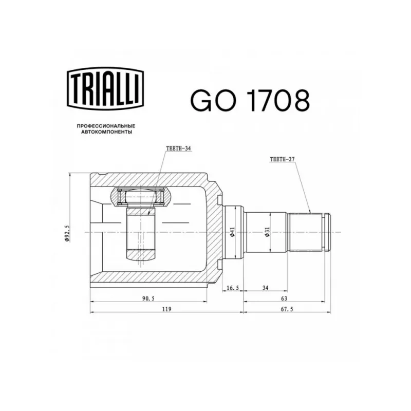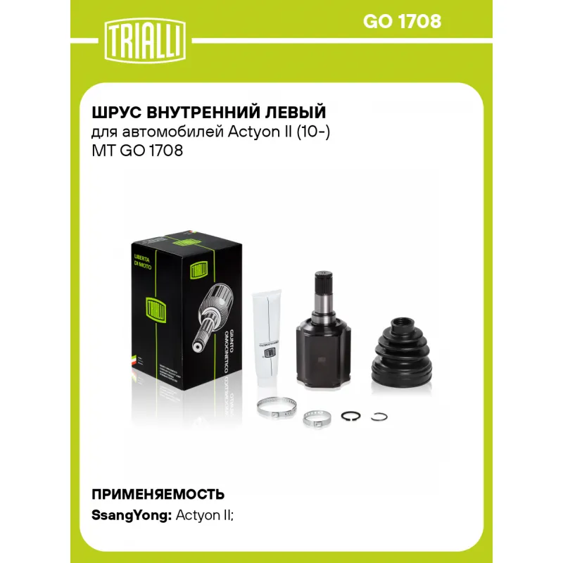 ШРУС внутренний левый для автомобилей Actyon II (10-) MT Характеристики: Артикул: GO 1708 OEM номера: 4130034111, 4130034110 Тип КПП: MT Материал пыльника: CR Количество на автомобиль: 1 Сопутствующие товары:: AR 1706, GO 1706, FG 1706 Ось (сторона установки): передняя, левая Длина, мм: 186,5 Внешнее зубчатое соединение со стороны КПП (внутр.): 27 Гарантийный срок: 2 года/60 000 км Внутреннее зубчатое соединение со стороны привода (внутр.): 34 Внешний диаметр, мм: 92,5 Сопутствующий товар: Ремонтные комплекты ШРУСов: FG 1704; FG 1705; FG 1706; FG 1707; FG 1708 Сопутствующий товар: ШРУСы: GO 1701; GO 1706; GO 1707; GO 1709; GO 1710 Товарная линейка: BLACK Подходит для авто: SsangYong Actyon II (10-) Для проверки применяемости отправьте VIN автомобиля через вкладку "Есть вопросы о товаре?" Комплектация: ШРУС - 1 шт Чехол ШРУСа - 1 шт Стопорное кольцо - 2 шт Хомут - 2 шт Тюбик со смазкой - 1 шт Гарантийный талон - 1 шт Гарантия: от 1 года.
