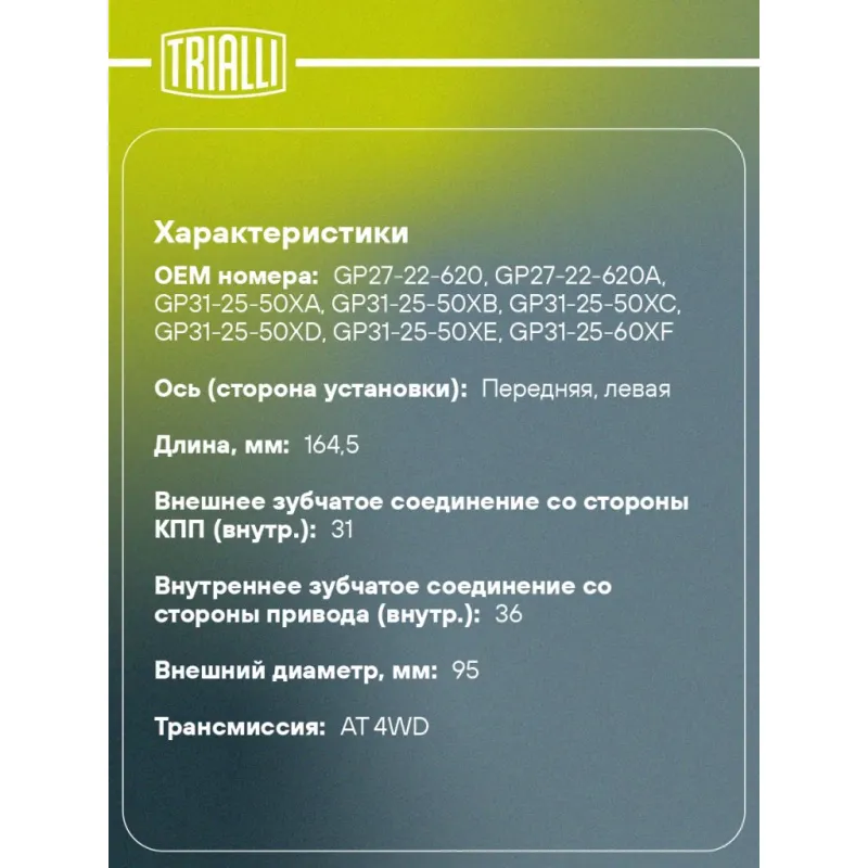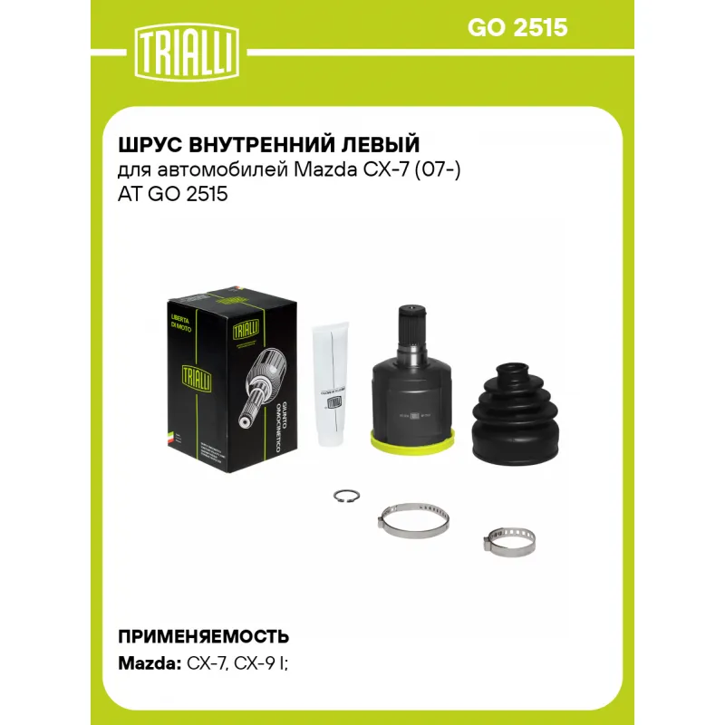 ШРУС внутренний левый для автомобилей Mazda CX-7 (07-) AT Характеристики: Артикул: GO 2515 OEM номера: GP27-22-620, GP27-22-620A, GP31-25-50XA, GP31-25-50XB, GP31-25-50XC, GP31-25-50XD, GP31-25-50XE, GP31-25-60XF Тип КПП: AT Материал пыльника: CR Парный товар: GO 2514 Количество на автомобиль: 1 Ось (сторона установки): передняя, левая Длина, мм: 164,5 Внешнее зубчатое соединение со стороны КПП (внутр.): 31 Гарантийный срок: 2 года/60 000 км Внутреннее зубчатое соединение со стороны привода (внутр.): 36 Внешнее зубчатое соединение со стороны колеса (внеш.): - Внутреннее зубчатое соединение со стороны колеса (внеш.): - Наличие/Отсутвие ABS: - Количество зубьев ABS: - Внешний диаметр, мм: 95 Внешений диаметр кольца ABS: - Размер резьбы: - Сопутствующий товар: Ремонтные комплекты ШРУСов: FG 2502; FG 2505; FG 2507 Сопутствующий товар: ШРУСы: GO 2513; GO 2514; GO 2517 Товарная линейка: BLACK Трансмиссия: AT 4WD Подходит для авто: Mazda CX-7 (07-), CX-9 I (07-), CX-7 (07-) Для проверки применяемости отправьте VIN автомобиля через вкладку "Есть вопросы о товаре?" Комплектация: ШРУС внутренний - 1 шт Стопорное кольцо - 1 шт Хомут - 2 шт Тюбик со смазкой - 1 шт Пыльник - 1 шт Гарантийный талон - 1 шт Гарантия: от 1 года.