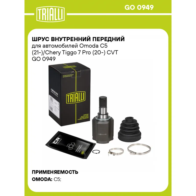 ШРУС внутренний передний для автомобилей Omoda C5 (21-)/Chery Tiggo 7 Pro (20-) CVT Характеристики: Артикул: GO 0949 OEM номера: 154000420AA, 154000419AA Ось (сторона установки): передняя Длина, мм: 169 Внешний диаметр, мм: 82 Внешнее зубчатое соединение со стороны КПП (внутр.): 27 Внутреннее зубчатое соединение со стороны привода (внутр.): 33 Тип КПП: CVT Гарантийный срок: 2 года/60 000 км Сопутствующий товар: ШРУСы: GO 0948 Сопутствующий товар: Приводы: AR 2737, AR 2738 Материал пыльника: CR Количество на автомобиль: 2 Товарная линейка: BLACK Комплектация: ШРУС - 1 шт Чехол ШРУСа - 1 шт Хомут - 2 шт Стопорное кольцо - 2 шт Смазка - 1 туба Гарантия: от 1 года.