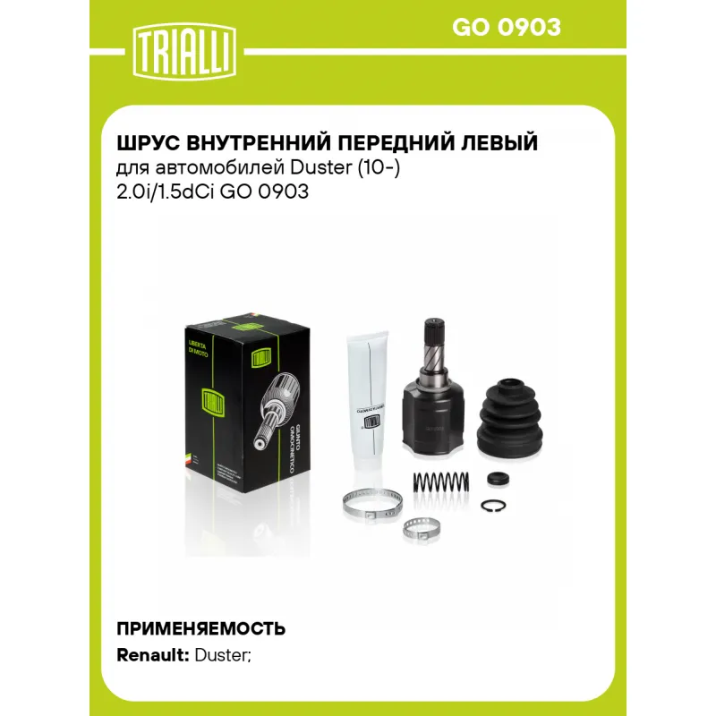 ШРУС внутренний передний левый для автомобилей Duster (10-) 2.0i/1.5dCi Характеристики: Артикул: GO 0903 OEM номера: 391017275R, 391019671R Тип КПП: MT Материал пыльника: CR Парный товар: GO 0902 Количество на автомобиль: 1 Сопутствующие товары:: FG 0903, GO 0904, GO 0907, AR 0905 Ось (сторона установки): передняя, левая Длина, мм: 182 Внешнее зубчатое соединение со стороны КПП (внутр.): 27 Гарантийный срок: 2 года/60 000 км Внутреннее зубчатое соединение со стороны привода (внутр.): 33 Внешний диаметр, мм: 87 Особенности конструкции:: трипойд Сопутствующий товар: Приводы: AR 0906 Сопутствующий товар: Ремонтные комплекты ШРУСов: FG 0903; FG 0904; FG 0905; FG 0906; FG 1808 Сопутствующий товар: ШРУСы: GO 0902; GO 0904; GO 0905; GO 0906; GO 0907 Товарная линейка: BLACK Подходит для авто: Renault Duster (10-) Для проверки применяемости отправьте VIN автомобиля через вкладку "Есть вопросы о товаре?" Комплектация: ШРУС - 1 шт Чехол ШРУСа - 1 шт Стопорное кольцо - 2 шт Хомут - 2 шт Пружина - 1 шт Шайба упорная - 1 шт Смазка - 1 шт Гарантия: от 1 года.