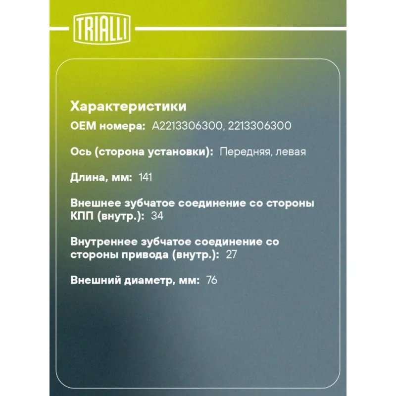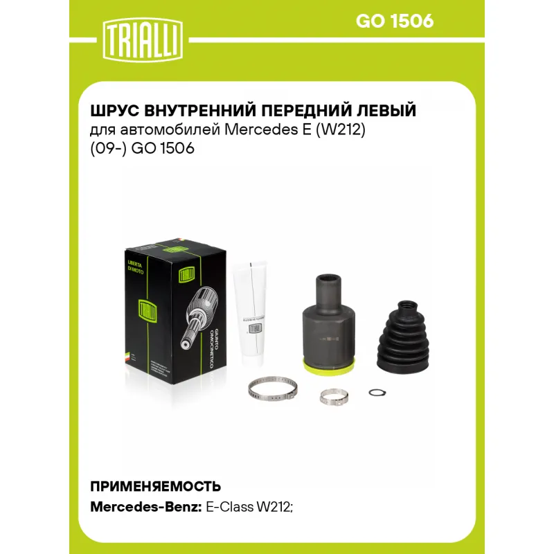 ШРУС внутренний передний левый для автомобилей Mercedes E (W212) (09-) Характеристики: Артикул: GO 1506 OEM номера: A2213306300, 2213306300 Тип КПП: AT Материал пыльника: CR Количество на автомобиль: 1 Ось (сторона установки): передняя, левая Длина, мм: 141 Внешнее зубчатое соединение со стороны КПП (внутр.): 34 Гарантийный срок: 2 года/60 000 км Внутреннее зубчатое соединение со стороны привода (внутр.): 27 Внешний диаметр, мм: 76 Особенности конструкции:: трипод Сопутствующий товар: Ремонтные комплекты ШРУСов: FG 1505, FG 1504, FG 1509, FG 1508 Товарная линейка: BLACK Подходит для авто: Mercedes-Benz E-Class W212 (09-) Для проверки применяемости отправьте VIN автомобиля через вкладку "Есть вопросы о товаре?" Комплектация: ШРУС - 1 шт Пыльник - 1 шт Хомут - 2 шт Стопорное кольцо - 1 шт Тюбик со смазкой - 1 шт Гарантийный талон - 1 шт Гарантия: от 1 года.