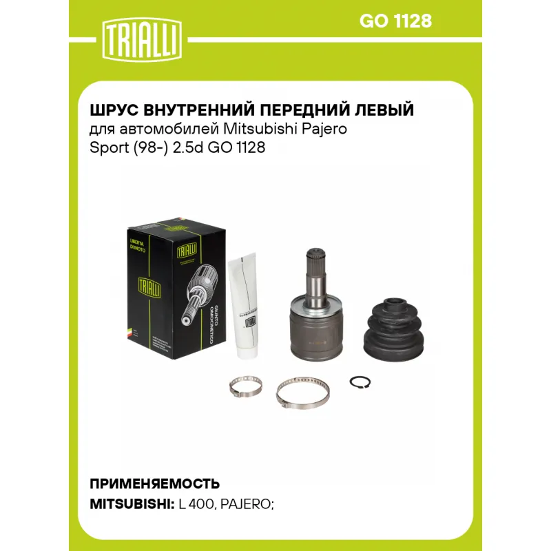 ШРУС внутренний передний левый для автомобилей Mitsubishi Pajero Sport (98-) 2.5d Характеристики: Артикул: GO 1128 OEM номера: MB886681 Тип КПП: MT/AT Материал пыльника: CR Парный товар: GO 1127 Количество на автомобиль: 1 Ось (сторона установки): передняя Длина, мм: 172 Внешнее зубчатое соединение со стороны КПП (внутр.): 28 Гарантийный срок: 2 года/60 000 км Внутреннее зубчатое соединение со стороны привода (внутр.): 26 Внешний диаметр, мм: 86 Особенности конструкции:: шариковый Сопутствующий товар: Ремонтные комплекты ШРУСов: FG 1103, FG 2302 Сопутствующий товар: ШРУСы: GO 1119, GO 1127 Товарная линейка: BLACK Комплектация: ШРУС - 1 шт Чехол ШРУСа - 1 шт Хомут - 2 шт Стопорное кольцо - 1 шт Тюбик со смазкой - 1 шт Гарантийный талон - 1 шт Гарантия: от 1 года.
