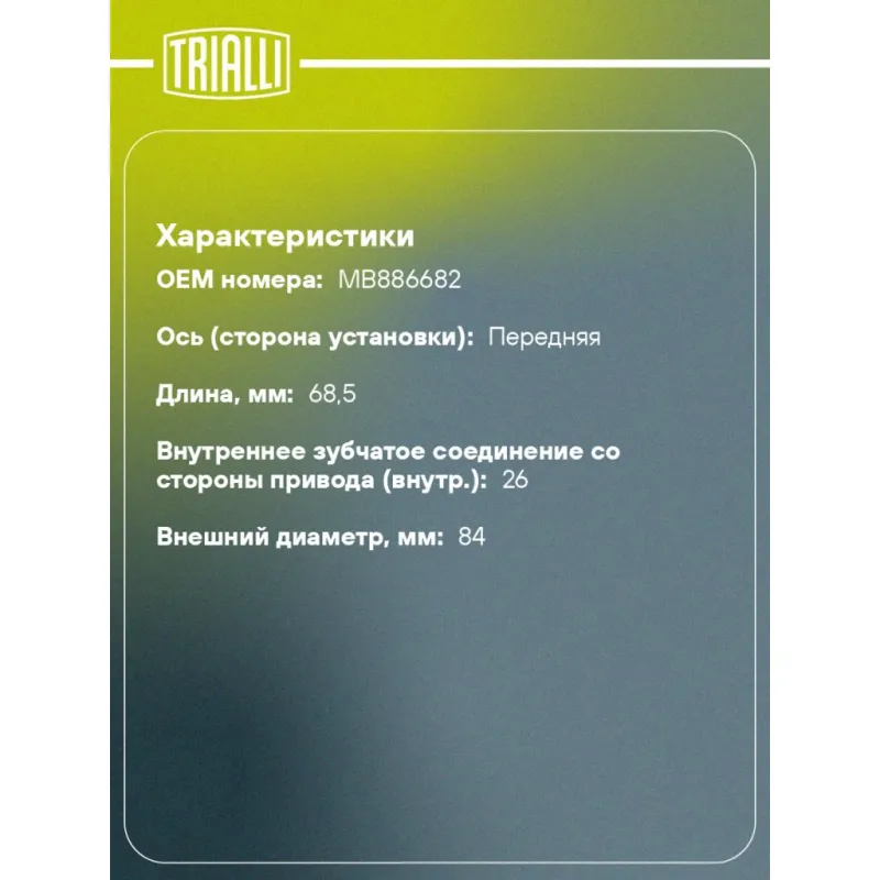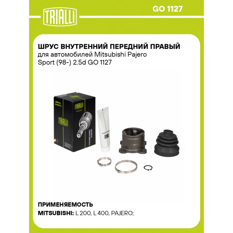 ШРУС внутренний передний правый для автомобилей Mitsubishi Pajero Sport (98-) 2.5d Характеристики: Артикул: GO 1127 OEM номера: MB886682 Тип КПП: MT/AT Материал пыльника: CR Парный товар: GO 1128 Количество на автомобиль: 1 Ось (сторона установки): передняя Длина, мм: 68,5 Гарантийный срок: 2 года/60 000 км Внутреннее зубчатое соединение со стороны привода (внутр.): 26 Внешний диаметр, мм: 84 Сопутствующий товар: Ремонтные комплекты ШРУСов: FG 1103 Сопутствующий товар: ШРУСы: GO 1119, GO 1128 Товарная линейка: BLACK Комплектация: ШРУС - 1 шт Чехол ШРУСа - 1 шт Хомут - 2 шт Стопорное кольцо - 1 шт Тюбик со смазкой - 1 шт Гарантийный талон - 1 шт Гарантия: от 1 года.
