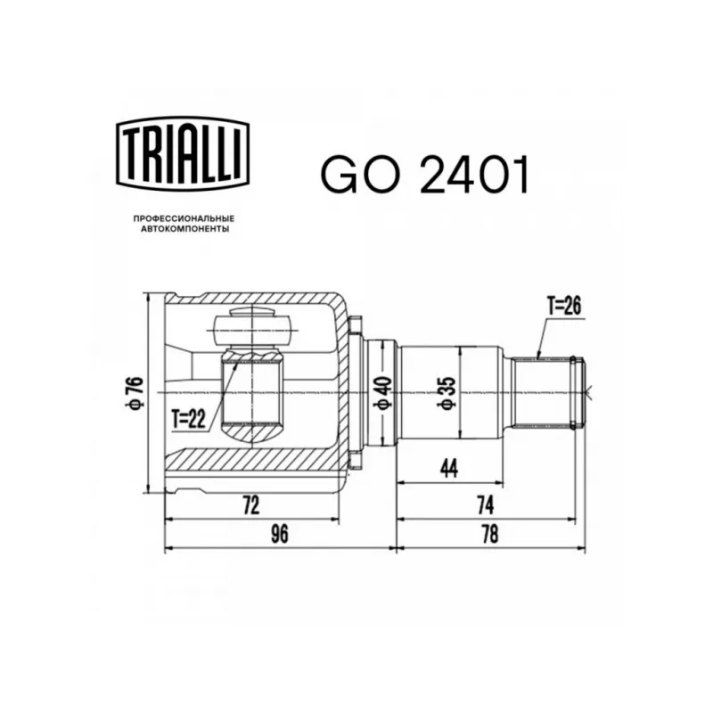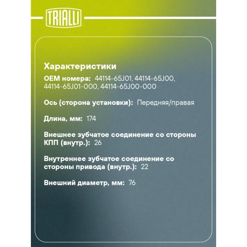 ШРУС внутренний правый для автомобилей Grand Vitara II (05-) Характеристики: Артикул: GO 2401 OEM номера: 44114-65J01, 44114-65J00, 44114-65J01-000, 44114-65J00-000 Тип КПП: MT/AT Материал пыльника: CR Количество на автомобиль: 1 Ось (сторона установки): передняя/правая Длина, мм: 174 Внешнее зубчатое соединение со стороны КПП (внутр.): 26 Гарантийный срок: 2 года/60 000 км Внутреннее зубчатое соединение со стороны привода (внутр.): 22 Внешний диаметр, мм: 76 Товарная линейка: BLACK Комплектация: ШРУС - 1 шт Чехол ШРУСа - 1 шт Хомут - 2 шт Стопорное кольцо - 1 шт Смазка - 1 шт Гарантия: от 1 года.